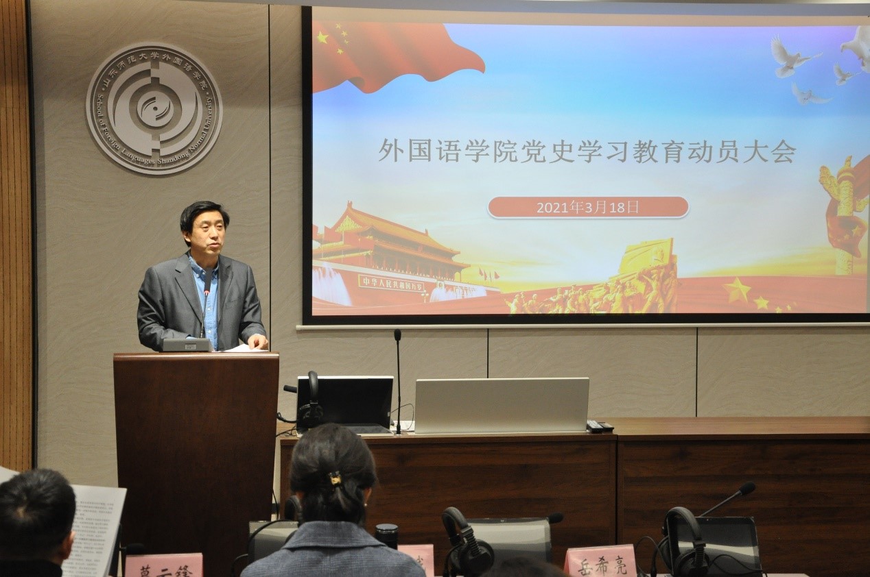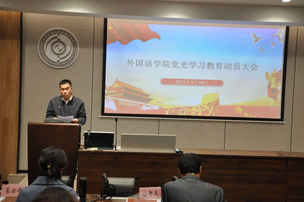 3月18日下午,外国语leyu(中国)党委在长清湖校区文渊楼B区242召开党史学习教育动员大会,深入学习贯彻习近平总书记在党史学习教育动员大会上的重要讲话精神,贯彻落实中央、省委、省委教育工委和学校党委对党史学习教育的任务要求,对leyu(中国)开展党史学习教育进行动员部署。学校党史学习教育督导组王会斌同志、赵丽娟同志出席本次会议,leyu(中国)领导班子成员、全体师生党员参加会议,党委委员、副院长陶业涛主持会议。
