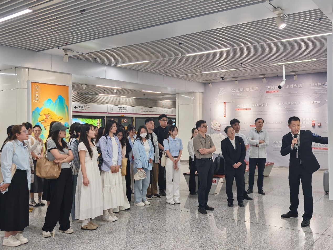 随后,全体党员乘地铁抵达济南西站廉洁文化主题车站开展沉浸式教育。站内“廉”字钟鼎纹饰墙与泉城印象浮刻柱海报生动诠释“一言九鼎、泉润清风”的廉洁意象,十二廉士浮雕长廊全景式展现管仲、晏婴等齐鲁先贤廉政风范。通过“廉政故事长廊+数字互动答题”立体化教育模式,全体党员实现了从历史廉政智慧到新时代纪律建设的认知跃迁,切实筑牢党员拒腐防变思想防线。