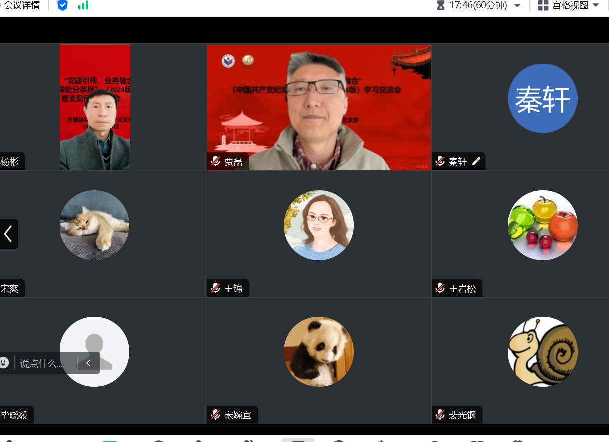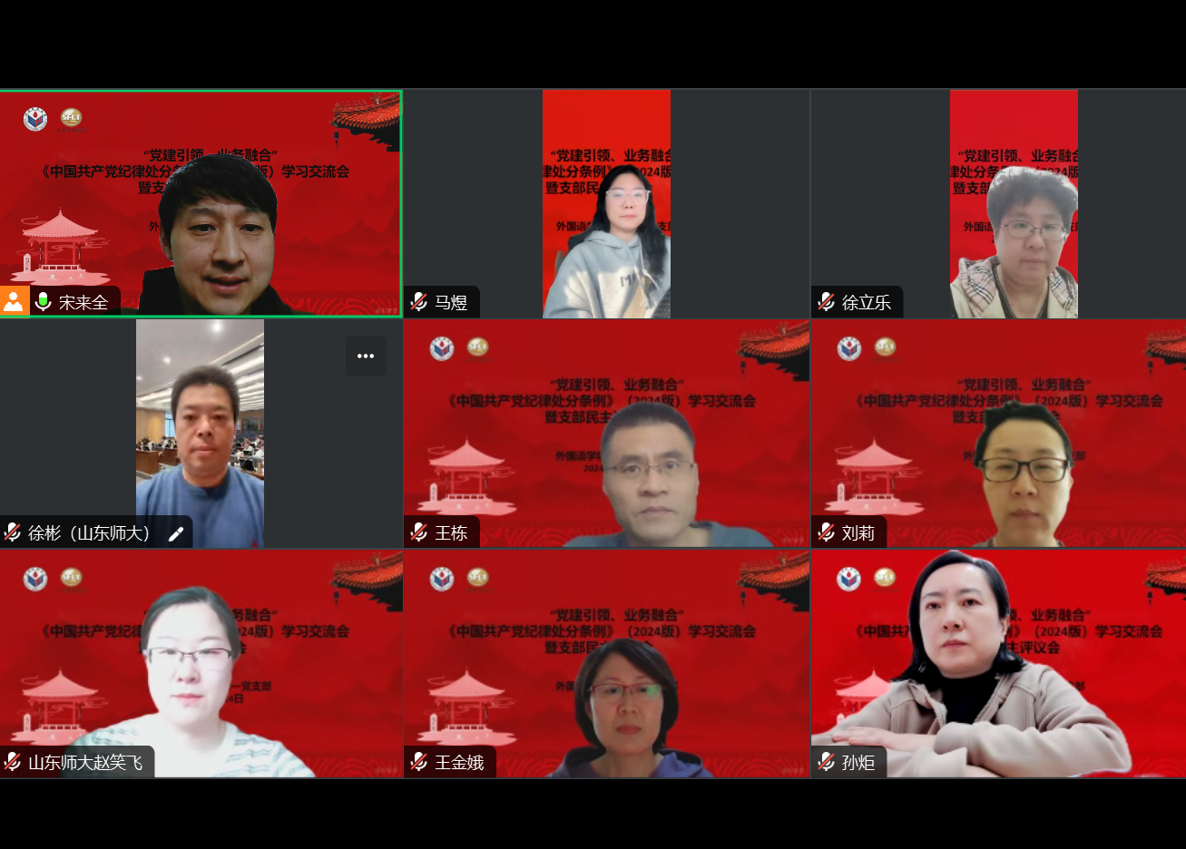 4月18日下午,外国语leyu(中国)教工一支部开展了《中国共产党纪律处分条例》(2024版)线上学习交流会,主会场会议由支部书记宋来全主持,分会场讨论活动由支委委员孙炬、王岩松,以及党小组组长赵笑飞、宋婉宜、何亦可主持。