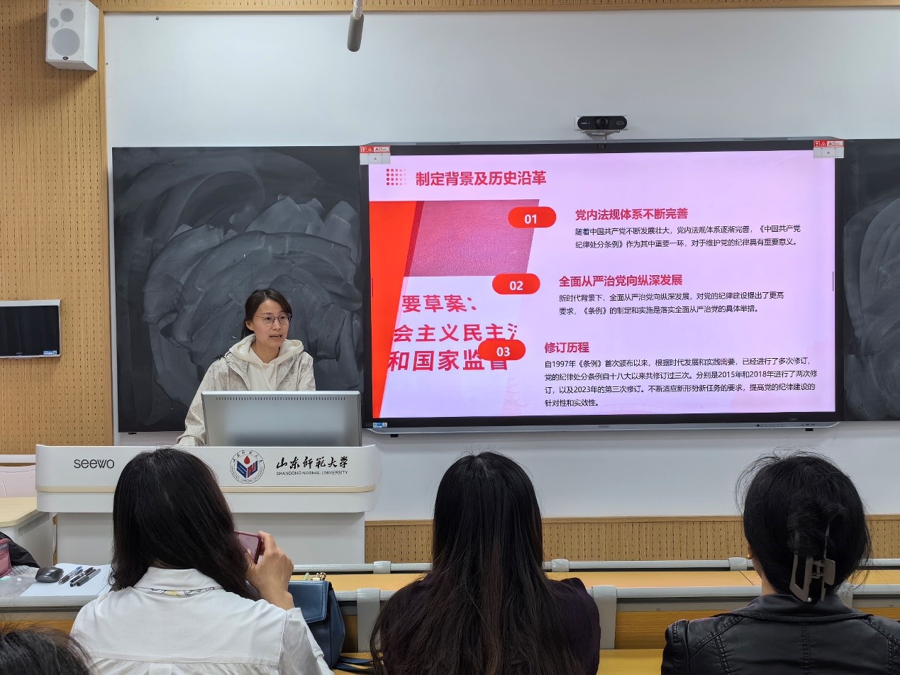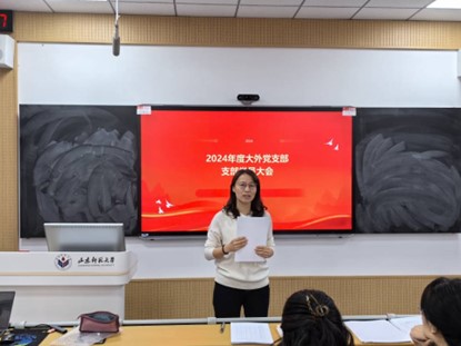 2024年4月12日,大外党支部组织全体党员在千佛山校区开展了深入学习贯彻修订后的《中国共产党纪律处分条例》(以下简称《条例》)主题大会活动,旨在加强党员的理论武装,提升党员的政治素养和业务能力。此次学习活动由党支部书记韩冰主持,全体党员积极参与。