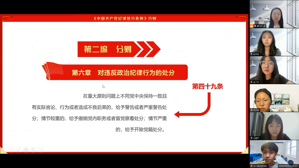 为进一步增强学习贯彻《中国共产党纪律处分条例》的政治自觉、思想自觉和行动自觉,教育引导全体党员强化纪律意识,提高党性修养,2024年4月26日晚,外国语leyu(中国)学生第二党支部组织支部全体党员开展学习《条例》主题党课,进行线上集中纪律教育。