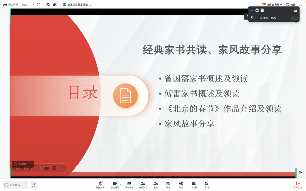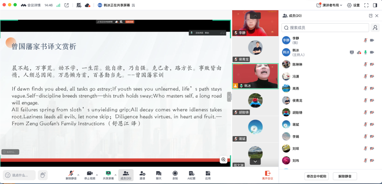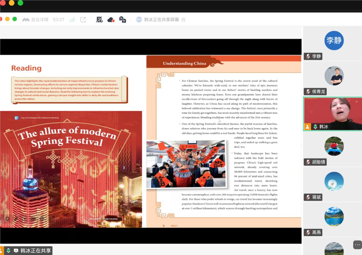 韩冰书记总结发言,她进一步指出,传统习俗是文化传承的重要载体。她建议老师们利用春节契机,带领家人体验各地仍保留的民俗活动,如高跷、花灯、庙会等,在亲身参与中激活文化记忆。同时,她引用《理解当代中国大学英语综合教程2》第一单元中关于春节现代化演变的文章,指出春节形式的变迁折射出中国社会的发展轨迹,但人们对团圆、祥和、国泰民安的美好向往始终未变。她强调,家风建设不仅关乎家庭和睦,更关系到民风社风,是文化自信的根基。家风正则民风淳,民风淳则国运兴。作为高校外语教育工作者,既要立足教学本职,做好文化传播与语言沟通的桥梁,也要在家庭与社会中自觉践行、传承优良家风,将个人修养、家庭建设与国家发展紧密结合。她向全体党员致以新春祝福,希望大家在享受团圆时光的同时,不忘党员使命,以实际行动弘扬传统文化,践行家国担当。