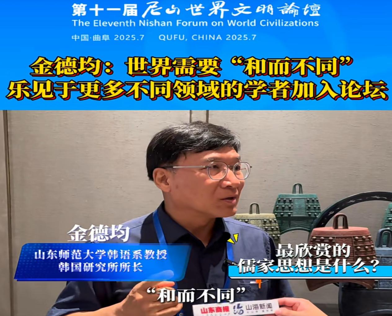 论坛召开期间,我院学者积极参与多场学术交流活动。韩国研究所所长金德钧教授以《儒家孝文化里的生命尊重和自然保护精神》为题发表演讲,系统阐述了儒家伦理思想对东亚生态观的深远影响。金教授指出,儒家孝文化蕴含着家庭伦理价值,体现了对自然万物的敬畏之情,对全球生态文明建设具有重要启示意义。他在接受媒体采访时还表示特别认可中国提出的“和而不同”的理念,这一理念在当今世界极端局势下显得更加难能可贵。