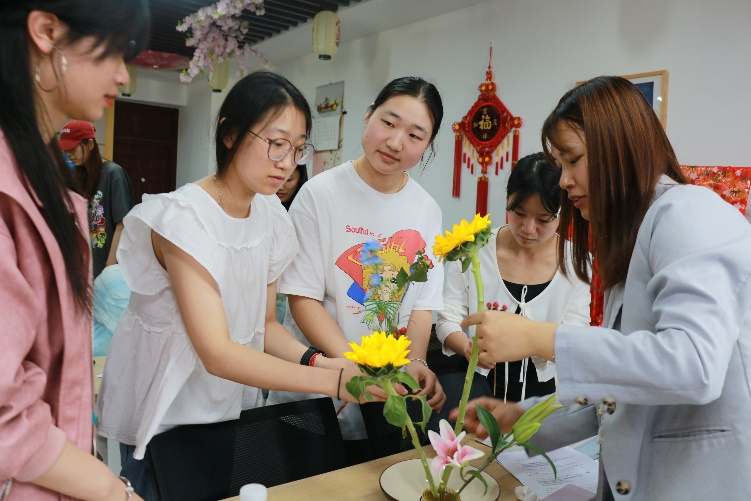 在接下来的插花体验环节,同学们以小组为单位,亲自动手体验制作了“盛花”样式的插花。同时,在大家制作的过程中,小林善帆老师给每个小组都进行了插花的技术指导,给大家解疑答惑,并对每个小组的作品都进行质量把关。最后在大家的插花作品制作完成后,由学生志愿者为每个小组的成员及其插花作品进行拍摄纪念,活动现场氛围融洽而活跃,参与者们在互动体验中加深了对日本传统花道文化的了解。