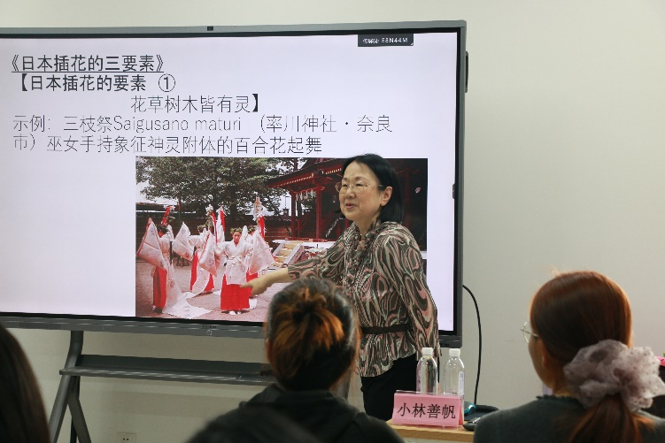 主持人季晓琳对到场师生表示欢迎,并简要介绍了本次花道体验会的流程安排。随后进入花道文化讲解环节,由小林善帆老师主讲。小林老师首先简要介绍了花道的起源并展示了不同历史时期不同的插花场景及形式。其中重点讲解了日本插花的三要素,即“花草树木皆有灵、观器赏花和佛前供花”,并指出这三种要素仍潜移默化地对今天日本的花道文化产生着影响。随后小林善帆老师分别详细讲解了“立花、投入花、生花、盛花”等几种不同形式的插花,并告诉大家在接下来的体验环节要动手制作的是“盛花”样式的插花。之后又介绍了近现代的插花艺术的特点和现代插花流派。同学们认真听讲,表现出对花道艺术的极大兴趣。
