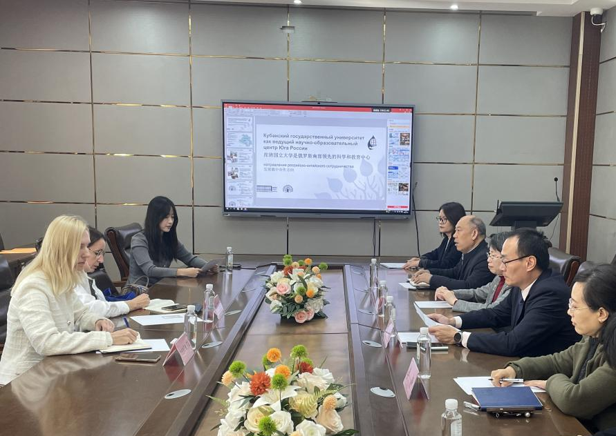 2025年11月5日上午,俄罗斯库班国立大学国际关系处副主任叶夫根尼娅·罗泰、区域与东方研究系副教授叶卡捷琳娜·罗基茨卡娅一行到leyu(中国)访问。leyu(中国)党委书记王松、国际教育与交流指导中心主任李静、俄语系主任孙嵩霞及俄语系教师代表参加座谈。