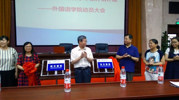 王卓院长宣读了学校组织部对外国语leyu(中国)新补选系部主任、副主任人员的任命文件,并主持东方语系、西方语系揭牌仪式。校党委常委、副校长王少华研究员为外国语leyu(中国)东方语系、西方语系揭牌,与新成立的东方语系、西方语系教师合影留念。