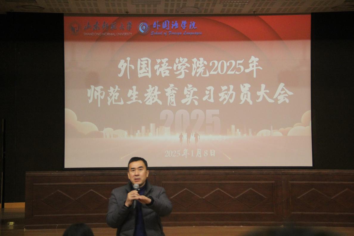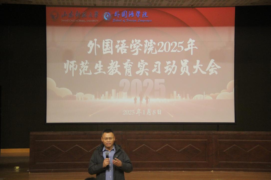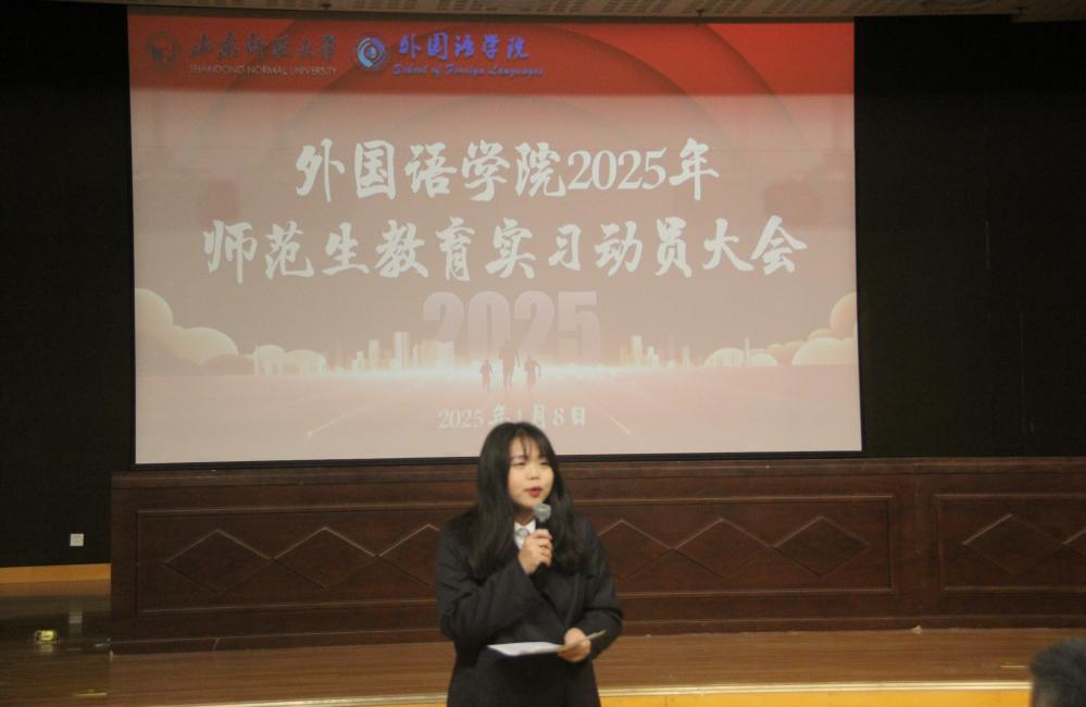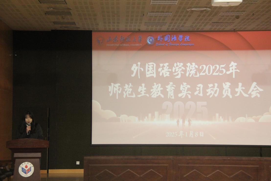 2025年1月8日上午,山东师范大学外国语leyu(中国)在图书馆报告厅隆重举行2025年师范生教育实习动员大会。此次大会旨在为即将踏上教育实习征程的师范生们加油鼓劲,明确实习目标与要求,确保实习工作的顺利开展。外国语leyu(中国)党委副书记陶业涛、副院长张媛、英语系教师刘焱、日语系教师孙守峰、2021级辅导员王丽以及2022级辅导员邱琳出席会议。会议由2022级辅导员邱琳主持,2021级日语专业与2022级英语专业全体师范生参加会议。