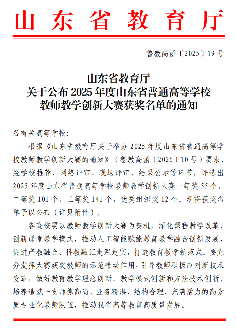 近日,根据《山东省教育厅关于公布2025年度山东省普通高等学校教师教学创新大赛获奖名单的通知》,我院教师韩冰率领的《国际人才英语》教学团队,获得省一等奖。这一佳绩的取得,实现了我院教师在教师教学创新大赛领域的一次新突破。