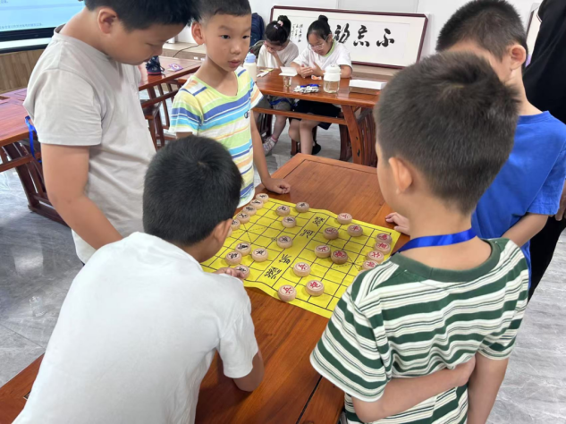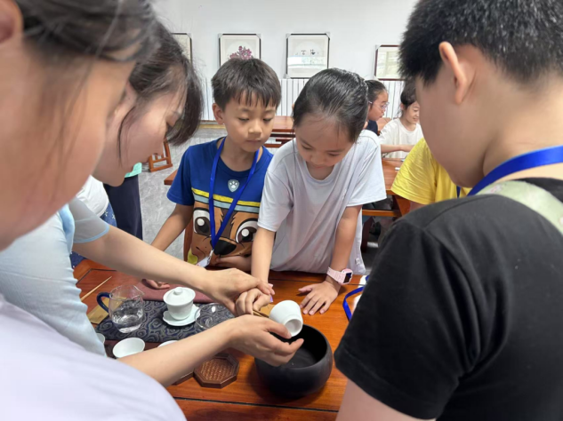 为促进孩子们身心健康发展,实践队设计了丰富多彩的趣味活动。茶艺体验活动前,志愿者们精心准备了茶具和儿童茶包,将茶艺简化为四个易学步骤,并在每个步骤中融入英语互动环节,准备简单的英语指令卡。活动中,志愿者们先用中文示范“温杯-投茶-冲泡-奉茶”的全过程,随后举起写有“Warm the cup”“Add tea”的卡片,带着孩子们逐词跟读。讲解“凤凰三点头”的冲泡手法时,一边演示手腕轻扬的动作,一边用英语引导:“Like this, nod three times—One, two, three!”。这样别开生面的茶艺体验,不仅让孩子们学习了茶艺非遗文化,更在双语互动中自然接触了基础英语表达。