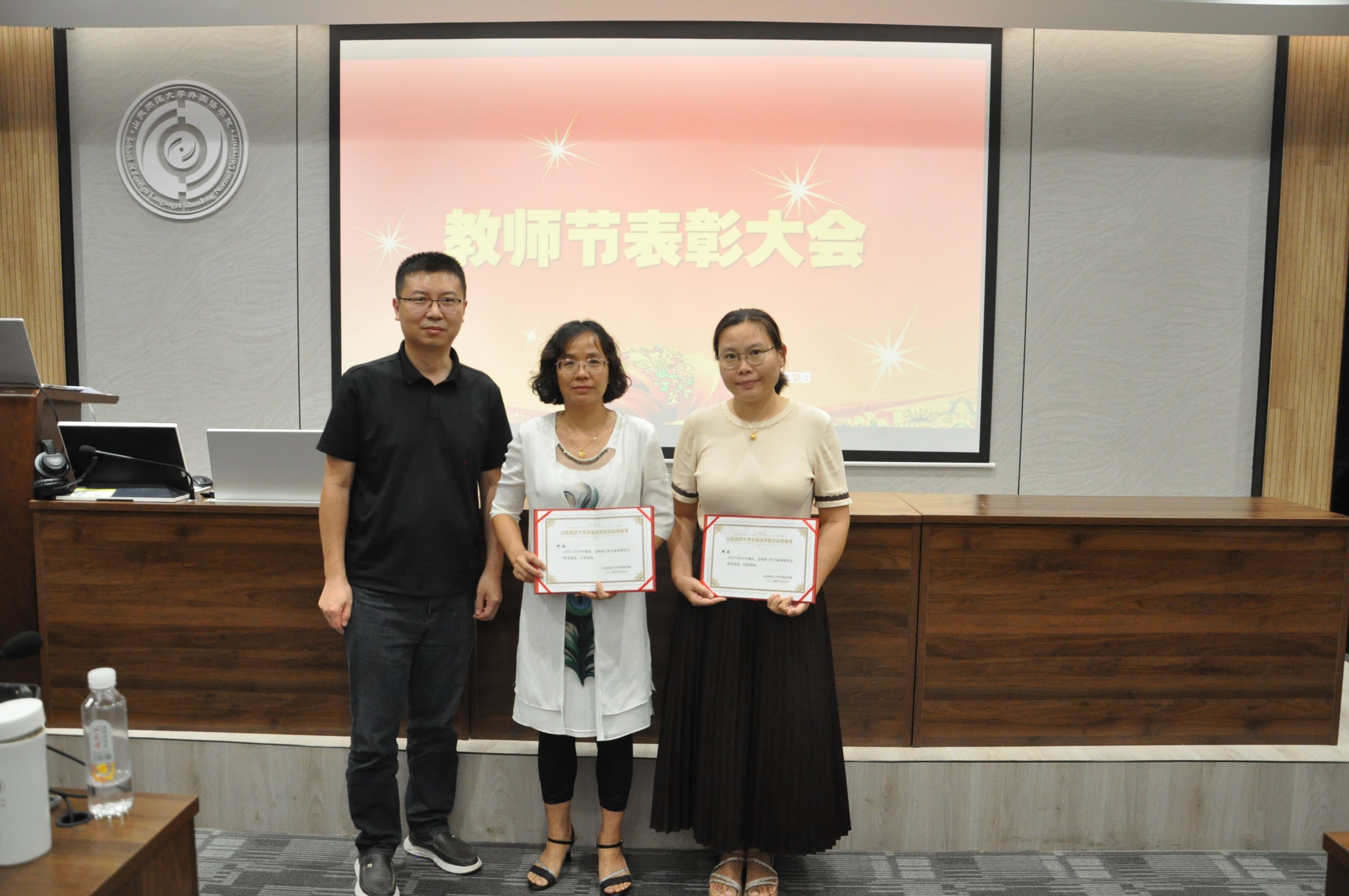 表彰仪式上,新入职的5位教师依次亮相并做自我介绍。陶业涛副书记宣读了《山东师范大学外国语leyu(中国)关于表彰杰出贡献奖、突出贡献奖的决定》。岳希亮书记为获得杰出贡献奖的省级示范性基层教学组织英美文学课程群教学团队、本科教育教学审核评估团队、校党员先锋岗(集体<团队>)标兵外国语leyu(中国)大外部大学英语教学比赛团队、校友联络工作团队、《山东外语教学》新媒体团队、全校学生竞赛组织团队颁发荣誉证书;王卓院长为在教学方面做出突出贡献的颁发荣誉证书;翟乃海副院长为在科研工作方面做出突出贡献的个人颁发荣誉证书;陶业涛副书记为在综合管理方面做出突出贡献的个人颁发荣誉证书。