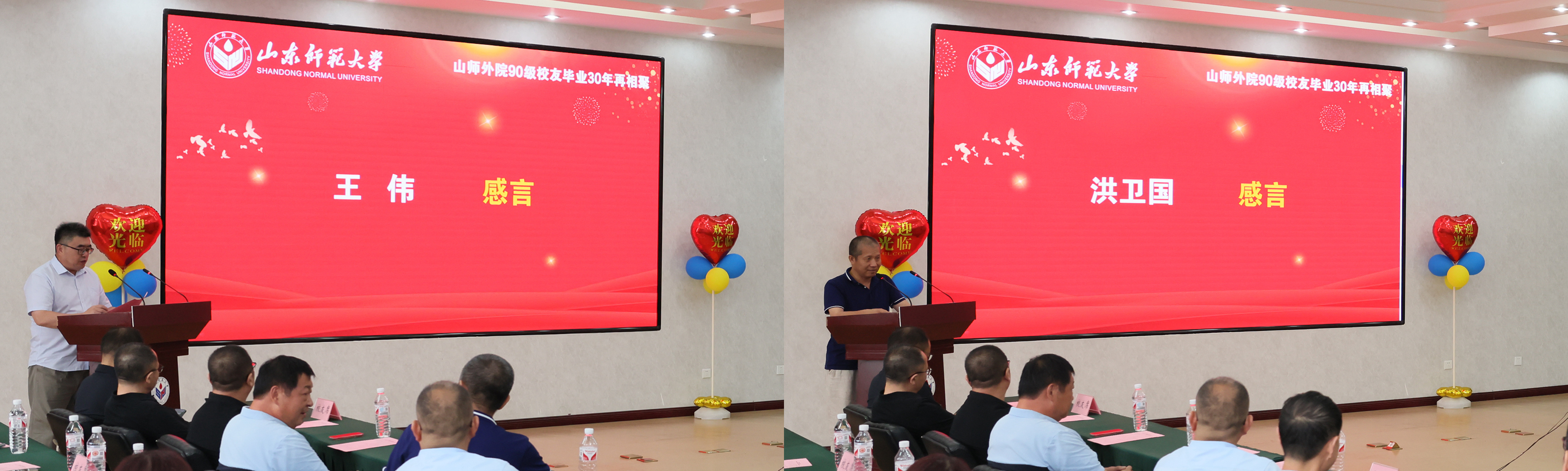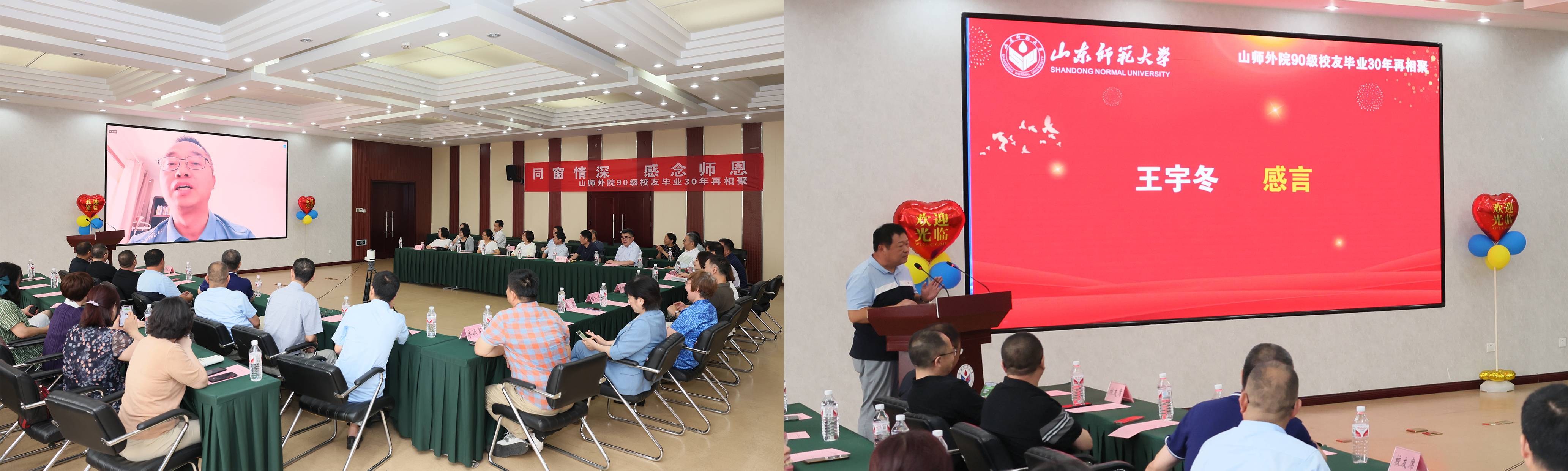 90级校友代表封立涛(俄罗斯,线上)、袁惠燕(加拿大,线上)、肖业文(新疆维吾尔自治区,线上)、王宇冬、王伟、洪卫国作为校友代表先后发表感言,回顾了青涩却难忘的青春岁月,感念母校和恩师的培养与教诲,流露出对母校、恩师和同学无限的思念之情,他们同时也分享了自己的奋斗历程和人生感悟。