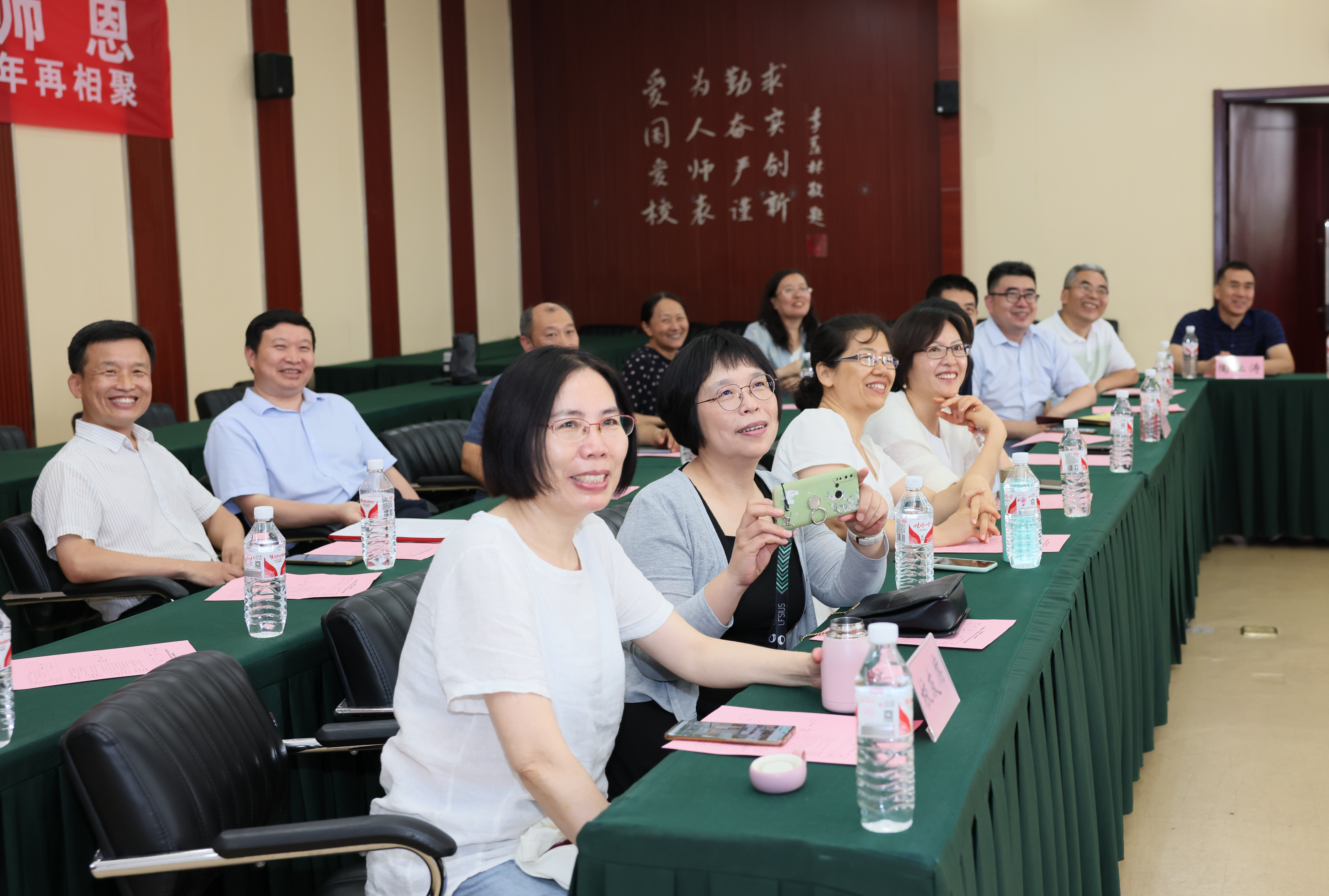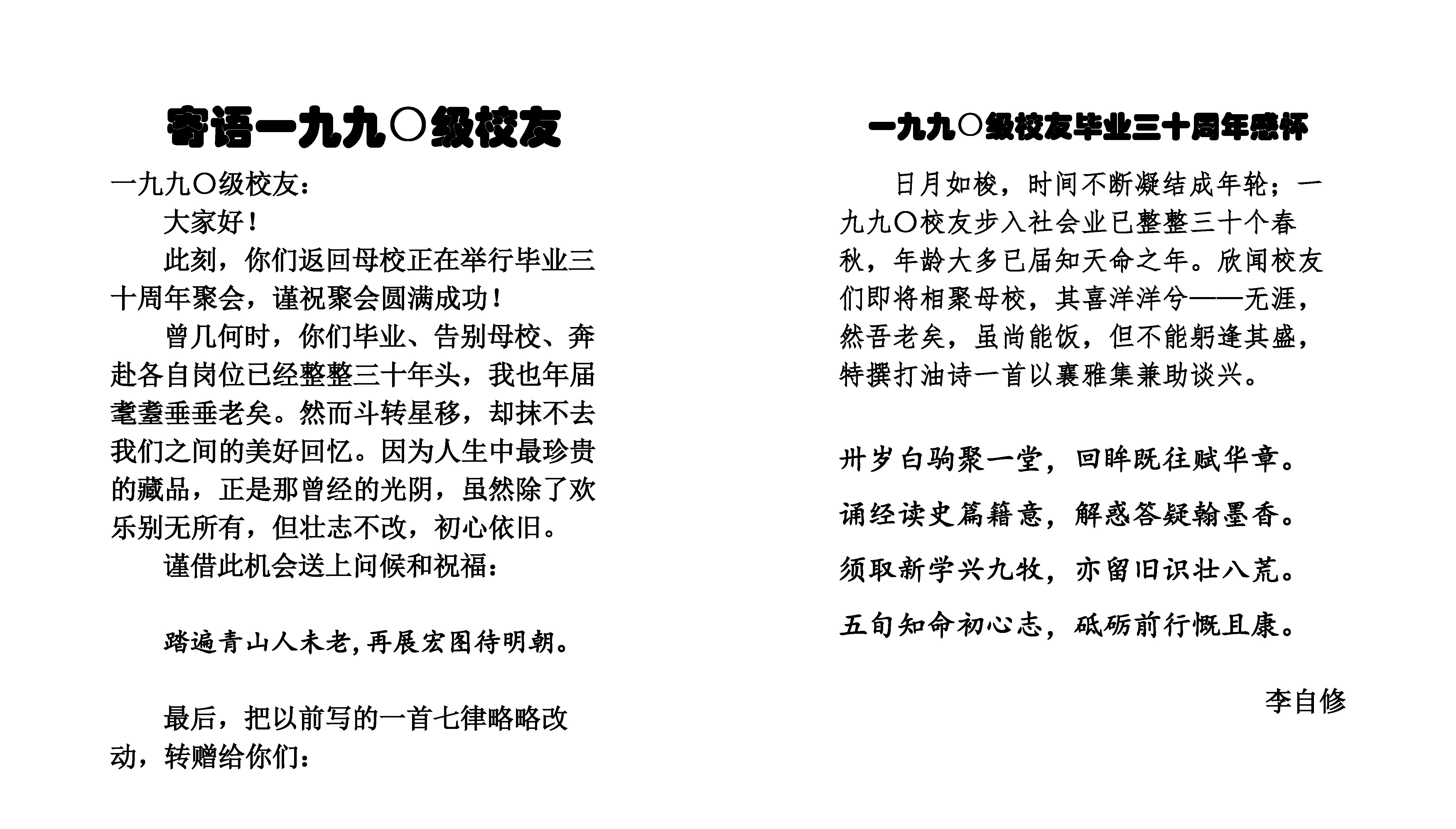 校友年届八旬的恩师李自修先生欣闻90级回访母校的消息,难掩激动与欣慰之情,亲笔致信,感慨历久弥新、更臻醇厚的师生情谊,并共勉曰,“踏遍青山人未老,再展宏图待明朝”,还欣然赋七律一首相赠。校友任课教师代表胡以男教授和惠敏教授,对他们当年所教的学生又当面“叮咛”了一次,勉励大家继续努力工作,坚持践行”弘德明志、博学笃行”的校训,为国家和社会做出更大的贡献。