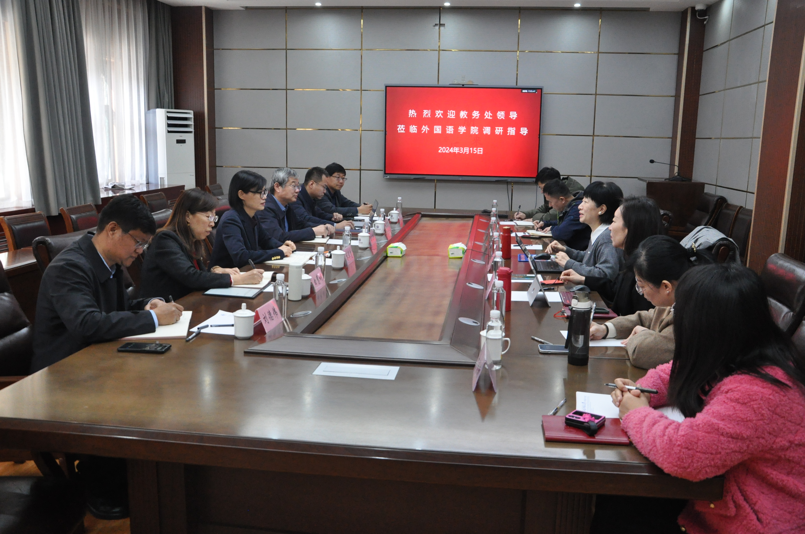 3月15日上午,学校教务处处长乔翠霞,副处长崔文新、曲慧娴、杜德彭,教务处综合办公室主任刘德伟、教学研究科主任王中杰等一行莅临外国语leyu(中国)调研指导工作。此次调研活动在长清校区文渊楼A313会议室举行。leyu(中国)院长王卓、副书记陶业涛、副院长张媛、党政办主任李源革、大外部副主任高燕、2020级辅导员付晓朦参加了座谈会。