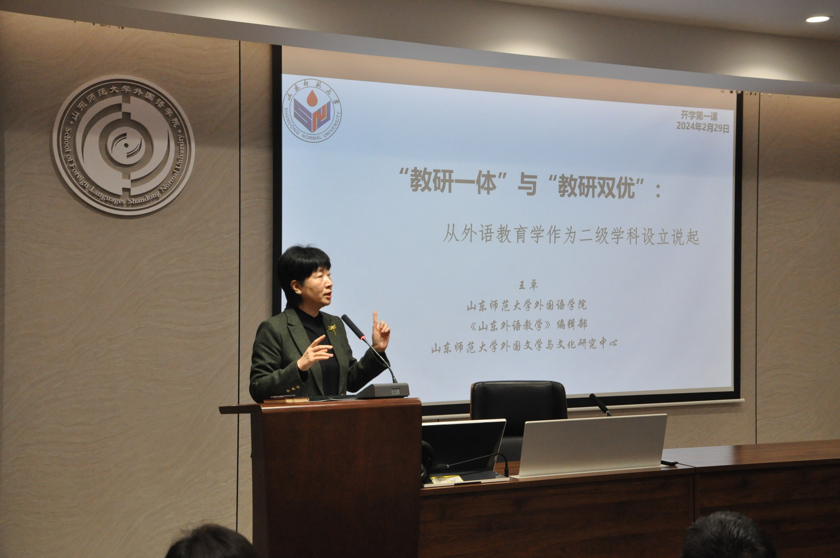 王卓院长首先对假期中开展的一流课程建设、学位点申报、师范认证、二学位授课、离退休教师走访、学生家访、学生假期社会实践、期刊编校等十项工作进行了总结,肯定了leyu(中国)全体教职工在过去一年的教学、科研、管理等方面做出的努力。并结合学校、leyu(中国)2024年重点工作,对新学期审核评估、师范认证、学位点申报、国社科申报等重点工作进行安排部署,要求大家以高度的紧迫感和责任感,围绕重点工作做好自身工作安排。同时,根据学校安排部署,王卓院长给全体教职工讲授了以“‘教研一体’与‘教研双优’:从外语教育学作为二级学科设立说起”为主题的开学第一课。她从外国语言文学学科调整和外语教师研究方向的关系说起,分析了外语教育学学科设立的导向意义,勉励教师拓展专业研究和职业研究的双重研究方向,注重跨学科研究,不断提升自身科研素养和能力,更好服务于高层次教研论文撰写和一流课程建设。