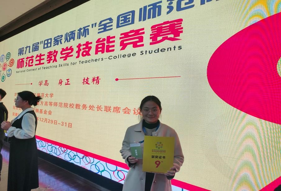 2023年12月29日至12月31日,“田家炳杯”第九届全国师范院校师范生教学技能竞赛决赛在浙江师范大学举行。我院选手晁丽文与来自全国各地的优秀选手同台竞技,在众多选手中脱颖而出,斩获全国一等奖。这是继上一届“田家炳杯”赛事我院徐立乐老师指导2020级王艺超同学获得一等奖后,师生又一次在此项重量级赛事中获得的殊荣。