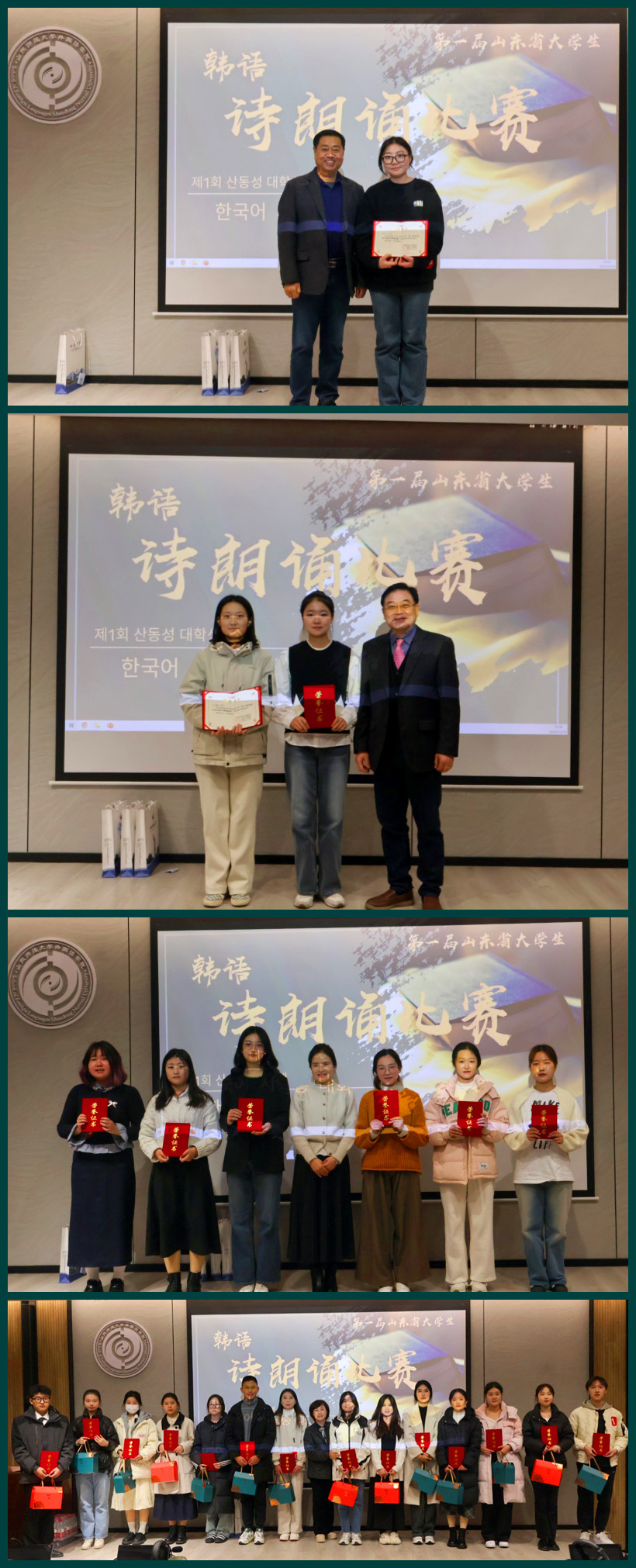 最终来自哈尔滨工业大学(威海)的黄智妍同学获得了总冠军,收获了3000元的比赛奖金,山东师范大学的王立敏同学和哈尔滨工业大学(威海)的姜恩菲同学获得了亚军和1000元奖金,中国海洋大学的杨思絮、王希悦,山东师范大学的高颖,烟台大学的金希妍、丁茹茹,青岛职业技术leyu(中国)的朴海兰6位同学获得了季军和500元的奖励,其他16位同学获得了优秀奖。李银永教授,崔惠景教授,金锡起教授和李浩教授分别为优秀奖,三等奖,二等奖和一等奖获奖选手颁奖。