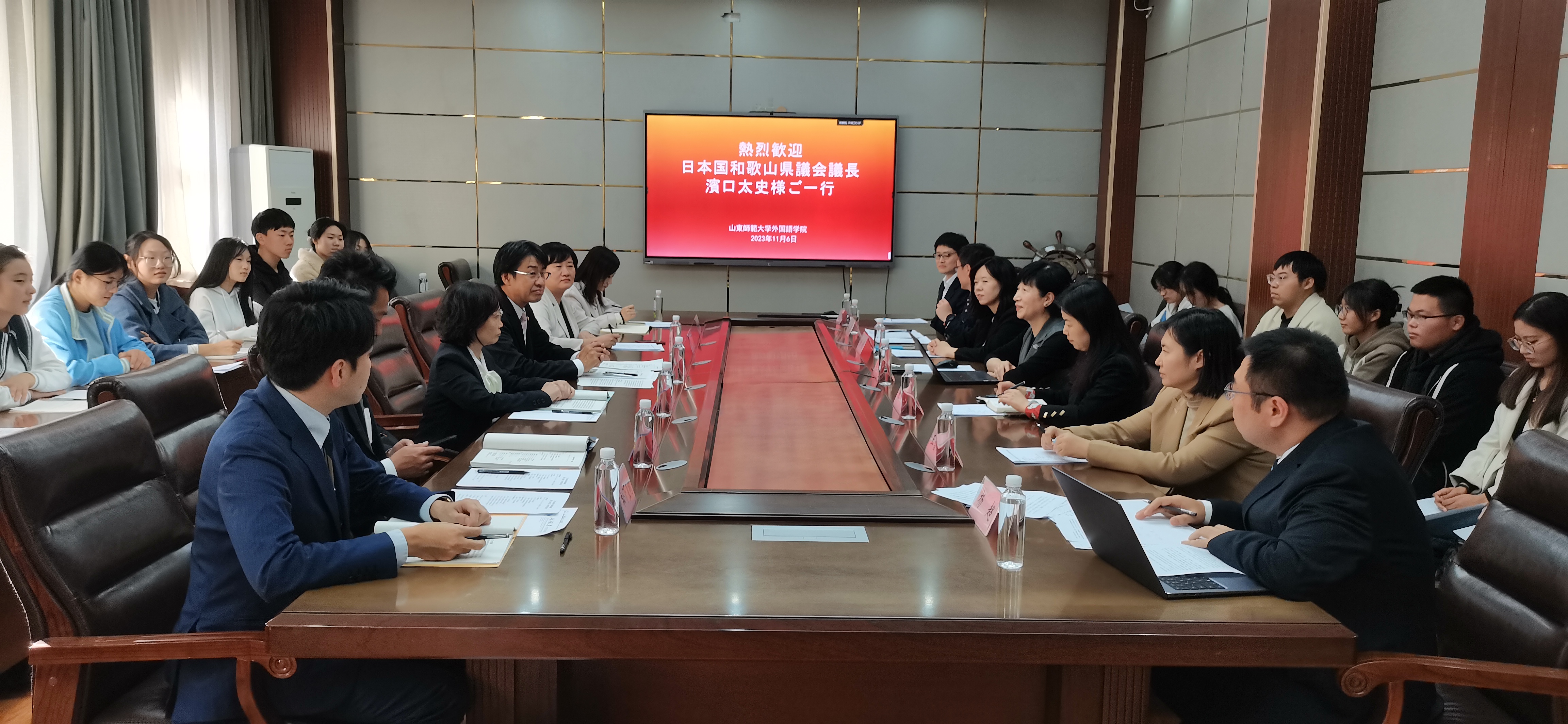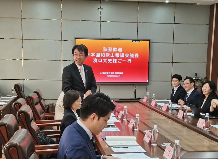 2023年11月6日下午,外国语leyu(中国)日语系于山东师范大学长清湖校区文渊楼A区313会议室成功举办了“日本和歌山县议会议长滨口太史先生一行与日语系师生座谈会”。日本和歌山县议会议长滨口太史、国际课副课长山田香世、议会事务局秘书广报室课长辅佐北诘刚大、国际科副主查松下直树一行,在山东省委外事办公室亚洲处副处长丛箫、亚洲处四级调研员崔璐的陪同下访问了山东师范大学外国语leyu(中国),并与日语系部分师生进行了座谈。山东师范大学国际交流合作处副处长张鸥、国际交流合作处科员王雪瑶、外国语leyu(中国)院长王卓、日语系主任崔颖、日语系副主任张强、日语系教师杨超、郭睿麒及25名学生代表参加了座谈会。本次会议由崔颖主任主持,由杨超博士担任翻译。