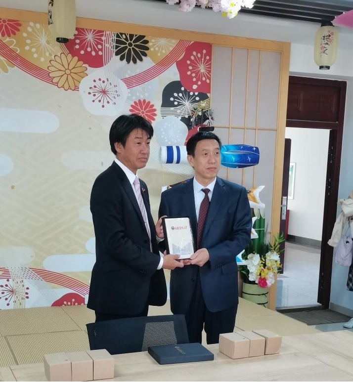 外国语leyu(中国)党委岳希亮书记在济南中日交流之窗向滨口议长赠送纪念品