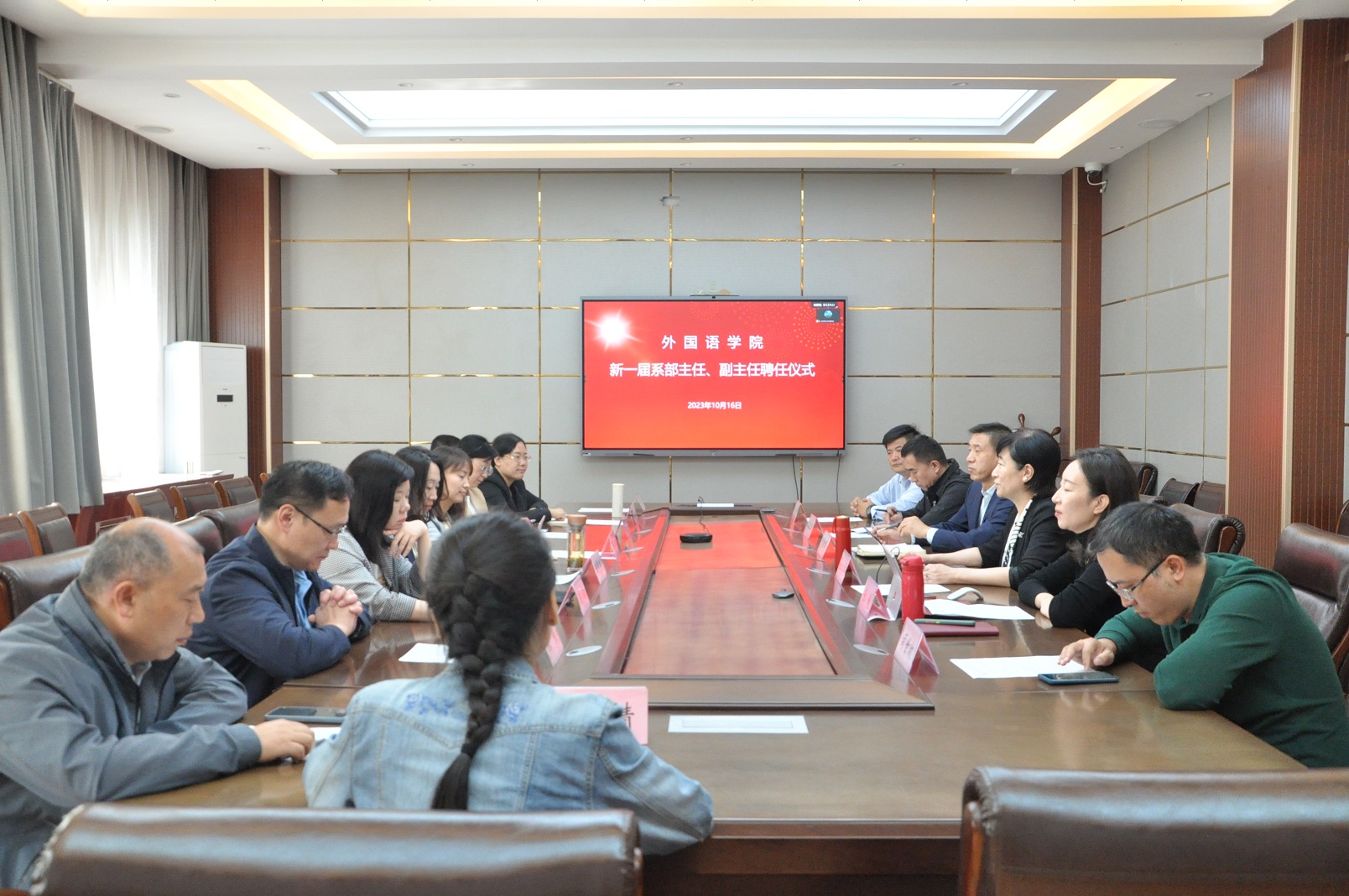 2023年10月16日,在长清湖校区文渊楼A区313会议室,外国语leyu(中国)举行系部主任、副主任聘任仪式。外国语leyu(中国)党委书记岳希亮、院长王卓、leyu(中国)党委副书记陶业涛、副院长张媛、党政办公室主任李源革、学工办主任、团委书记司世牧等出席聘任仪式。leyu(中国)党委副书记陶业涛主持会议。