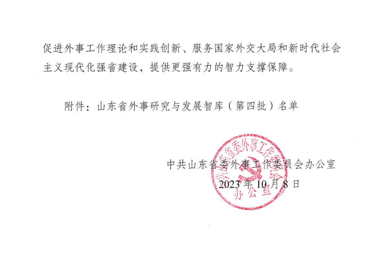 近日,中共山东省委外事工作委员会办公室发布了《关于公布山东省外事研究与发展智库(第四批)名单》的通知。省委外办按照《关于开展外事研究与发展智库建设的实施意见》相关规定,经过严格的评审程序,确定了8家研究机构为山东省外事研究与发展智库(第四批)。由我院王卓院长主持的山东省与东非地区交流合作研究中心成功入选。