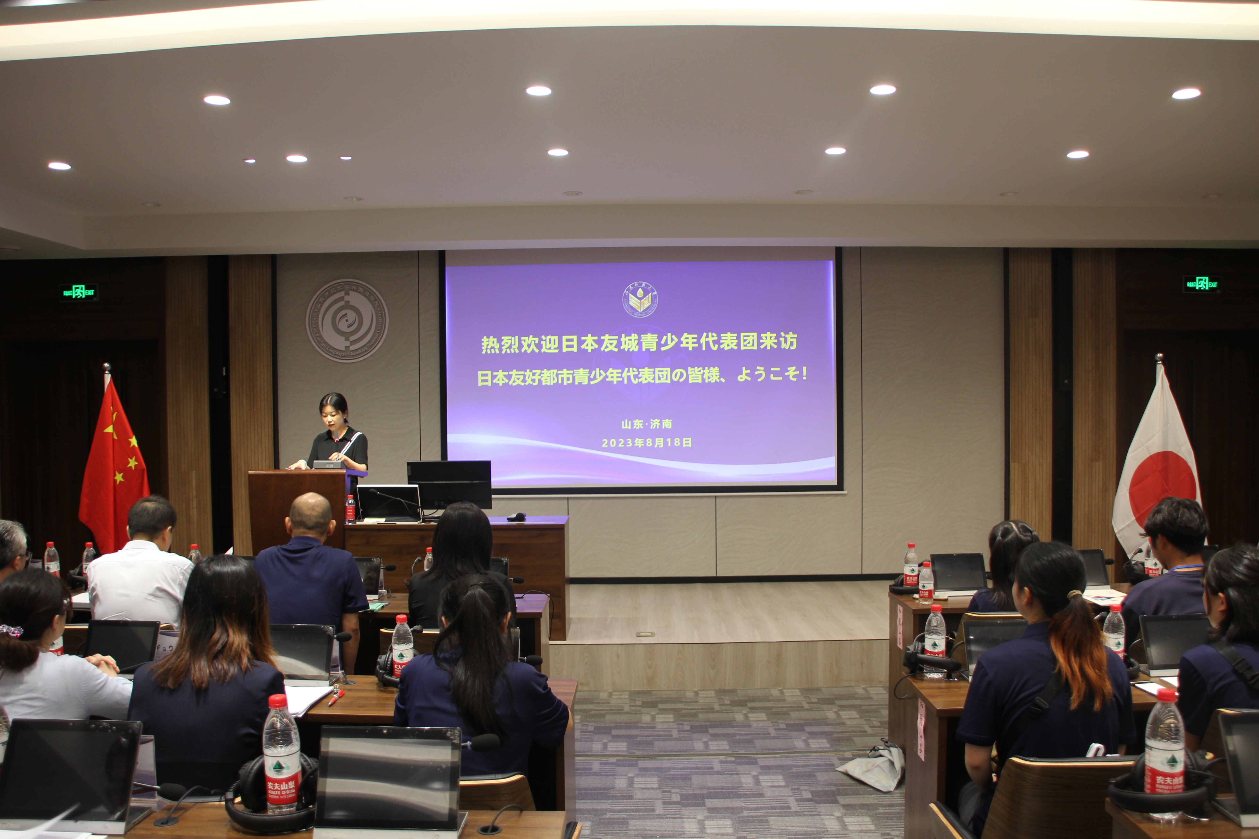 2023年8月18日下午,山东师范大学外国语leyu(中国)根据我校国际交流与合作处的安排,在长清湖校区文澜楼B区242会议室承办了日本友城青少年代表访鲁交流营接待活动。外国语leyu(中国)日语系部分师生与来自日本和歌山县、下关市、木更津市、足立市、泉佐野市的60名师生代表进行了交流互动。山东省对外友好协会联络处生加国副处长以及来自济南、青岛、东营、济宁、威海等市外办相关人员陪同交流团一同来我校参加交流会。我校国际交流与合作处张鸥副处长、外国语leyu(中国)党委岳希亮书记、日语系崔颖副主任及12名本科生、研究生参加了此次交流活动。活动由张鸥副处长主持,此次活动共有嘉宾发言致辞、中日学生交流互动、参观济南中日交流之窗等环节。