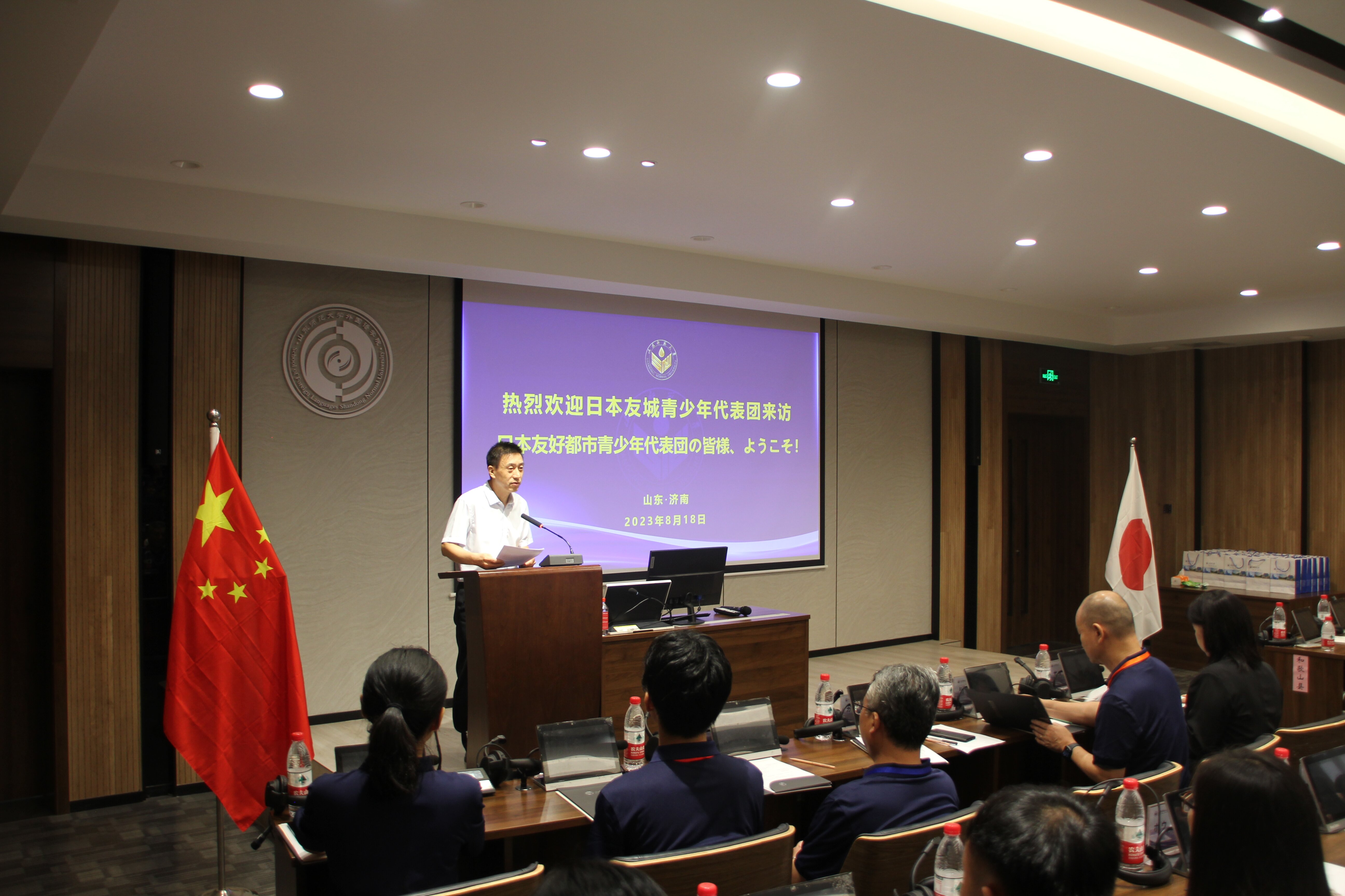 在张鸥副处长介绍了出席嘉宾后,首先由外国语leyu(中国)岳希亮书记致辞,他对日本访鲁交流营表示了热烈欢迎后,介绍了山东师范大学的历史及发展现状,并表达了对在座诸位的美好祝愿。随后,日本泉佐野市国际交流课川野宪二课长发言。川野宪二课长在发言中首先介绍了泉佐野市与我省的交流历史及此次活动的意义,并对参与此次活动的中日学生表达了自己的期望。之后,立命馆大学产业社会专业江口辽同学作为日方学生代表发言。他在发言中表达了能够参与此次活动的感谢之情和对结交中国朋友的期待。最后崔颖副主任介绍了日语系的国际交流情况,并邀请访鲁交流营参观济南中日交流之窗,最后崔副主任祝福参加本次活动的中日青少年通过交流缔结深厚而长久的友谊。