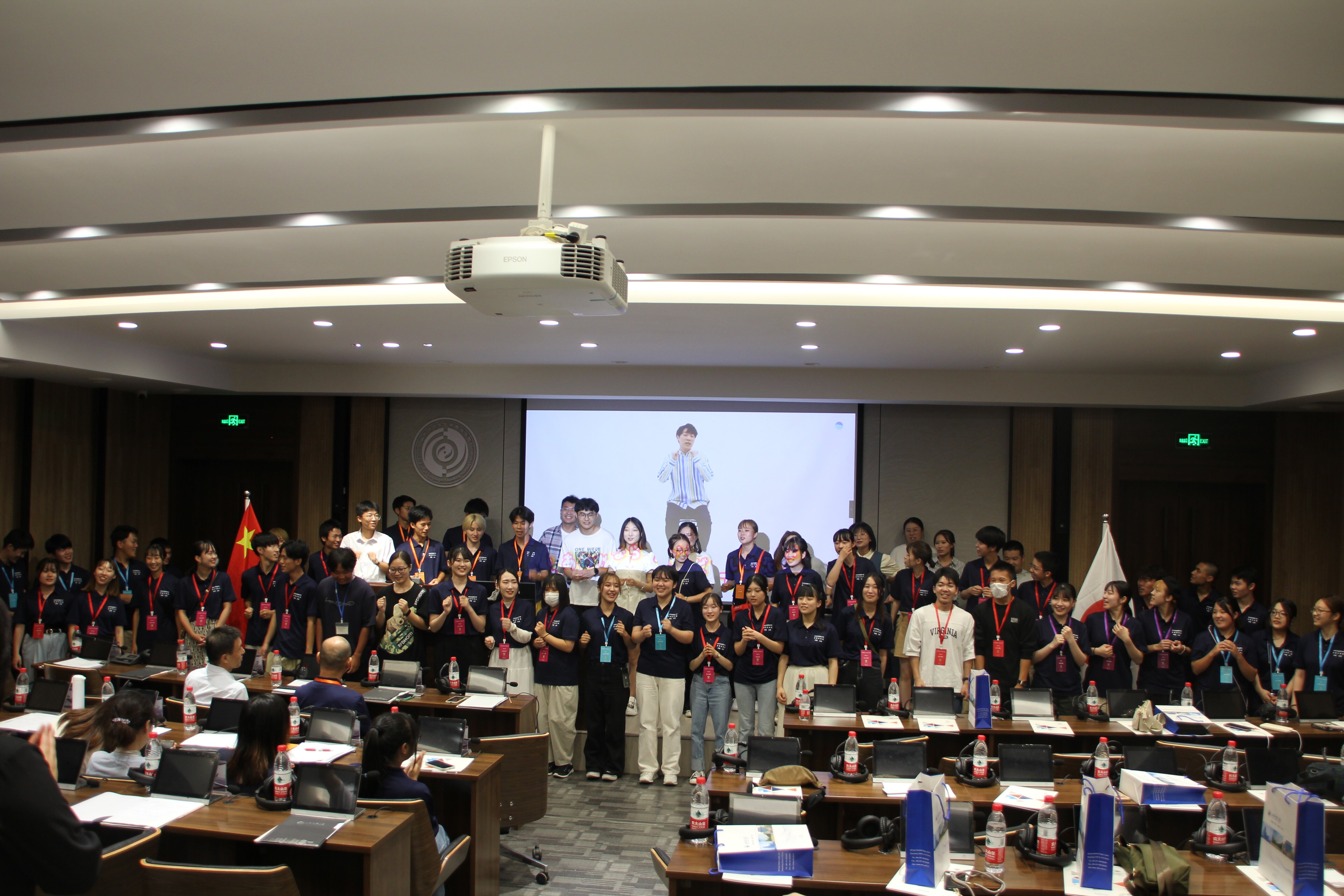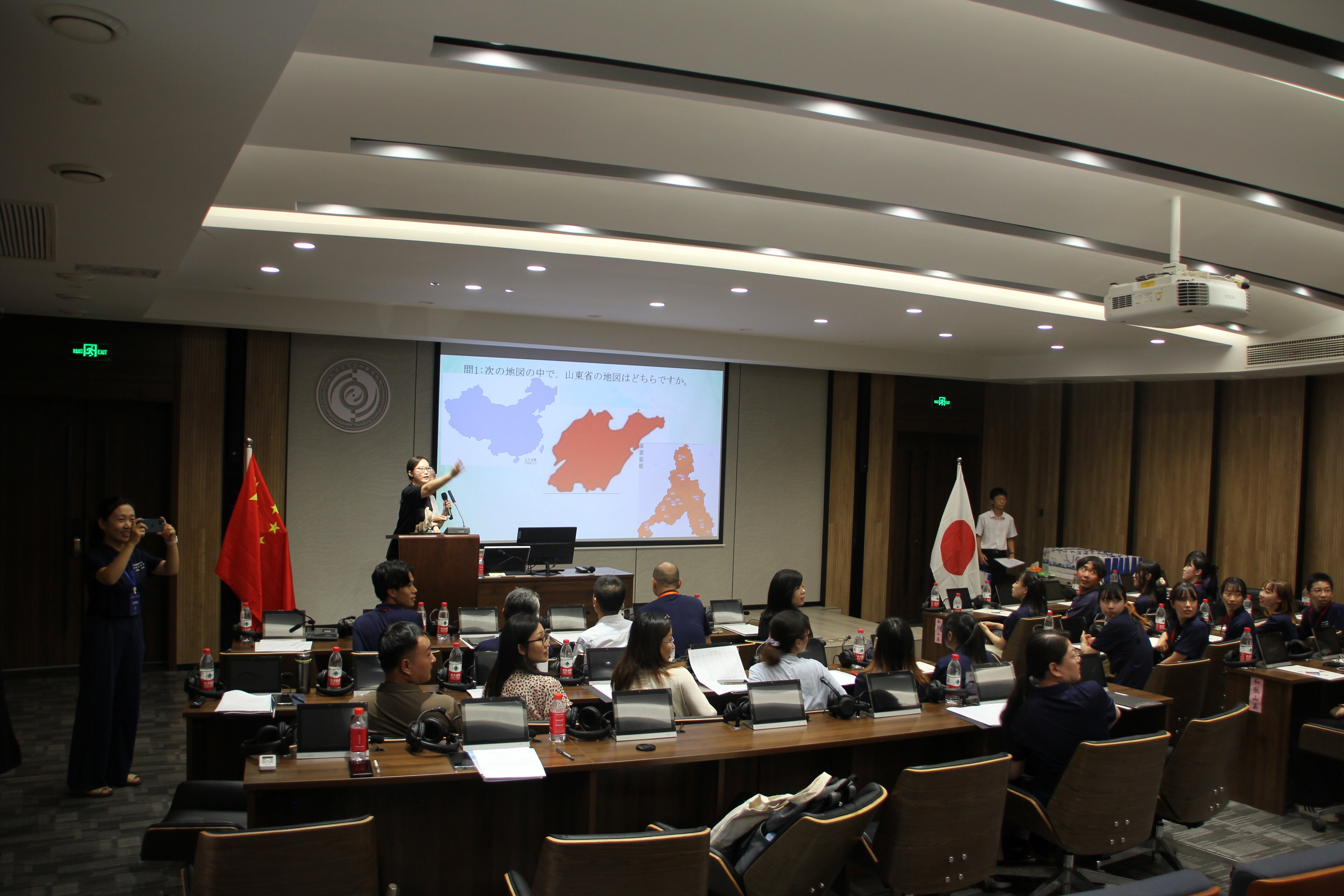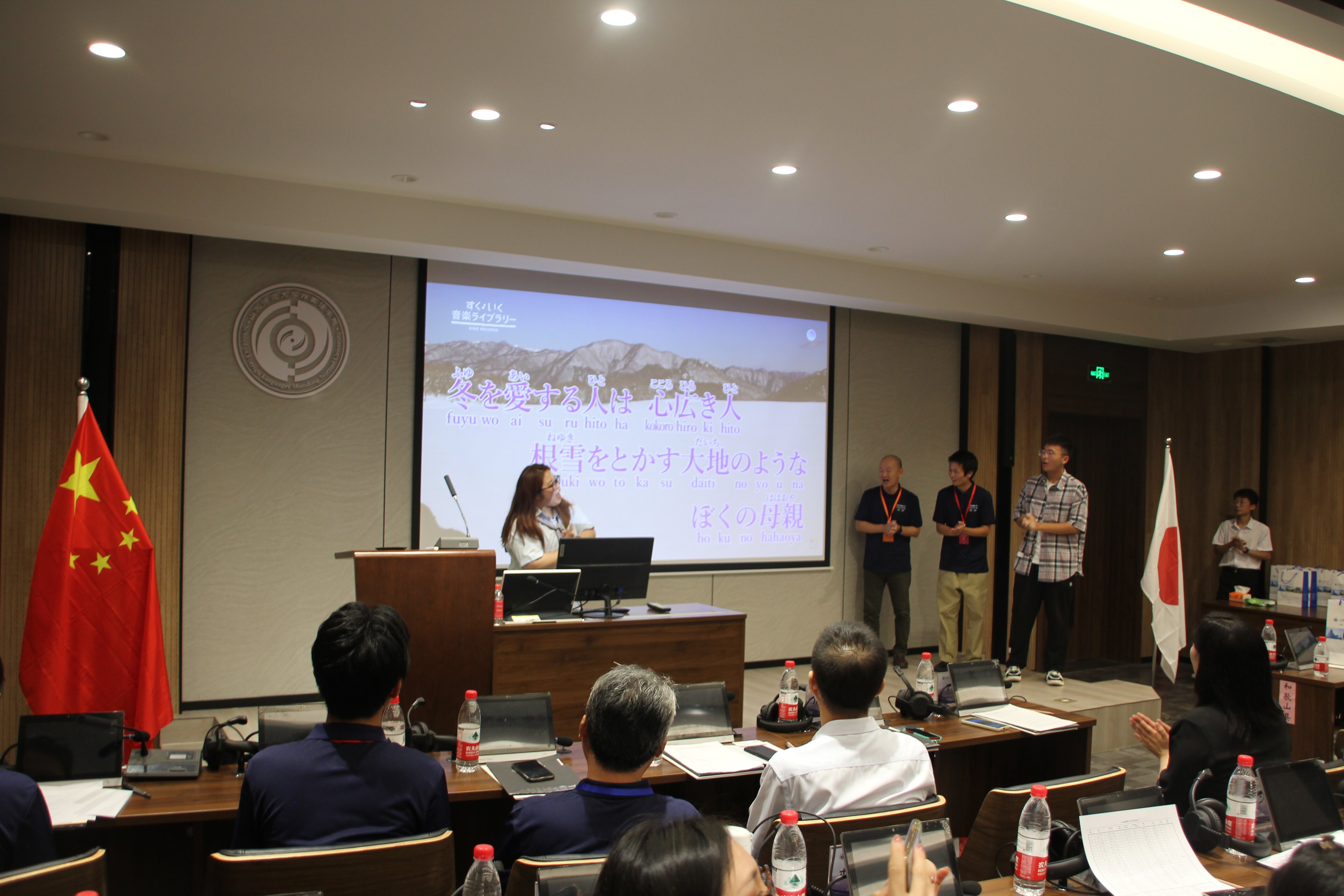 接下来的中日学生交流互动环节,由济南中日交流之窗学生志愿者负责人,日语系2020级丁旭同学主持。第一个环节是日语翻译硕士专业2022级李宜真、贾征征同学主持的有奖竞猜活动。竞猜题共九道,以齐鲁文化、山东名胜、鲁日友好交往为中心,在答题过程中帮助日本师生深入了解山东、回顾鲁日友好交往历史。日本学生踊跃举手答题,竞争氛围激烈。第二个环节是中日民谣对唱。首先由日语系本科生2020级马菁璐、2022级杨洋同学演唱中国民谣《茉莉花》,之后两人邀请交流营的池谷友宏同学和川野宪二课长共同演唱日本民谣《四季歌》,气氛热烈活跃。最后,中日同学全体上台大合唱童谣《如果幸福你就拍拍手(幸せなら手を叩こう)》,现场气氛达到高潮。