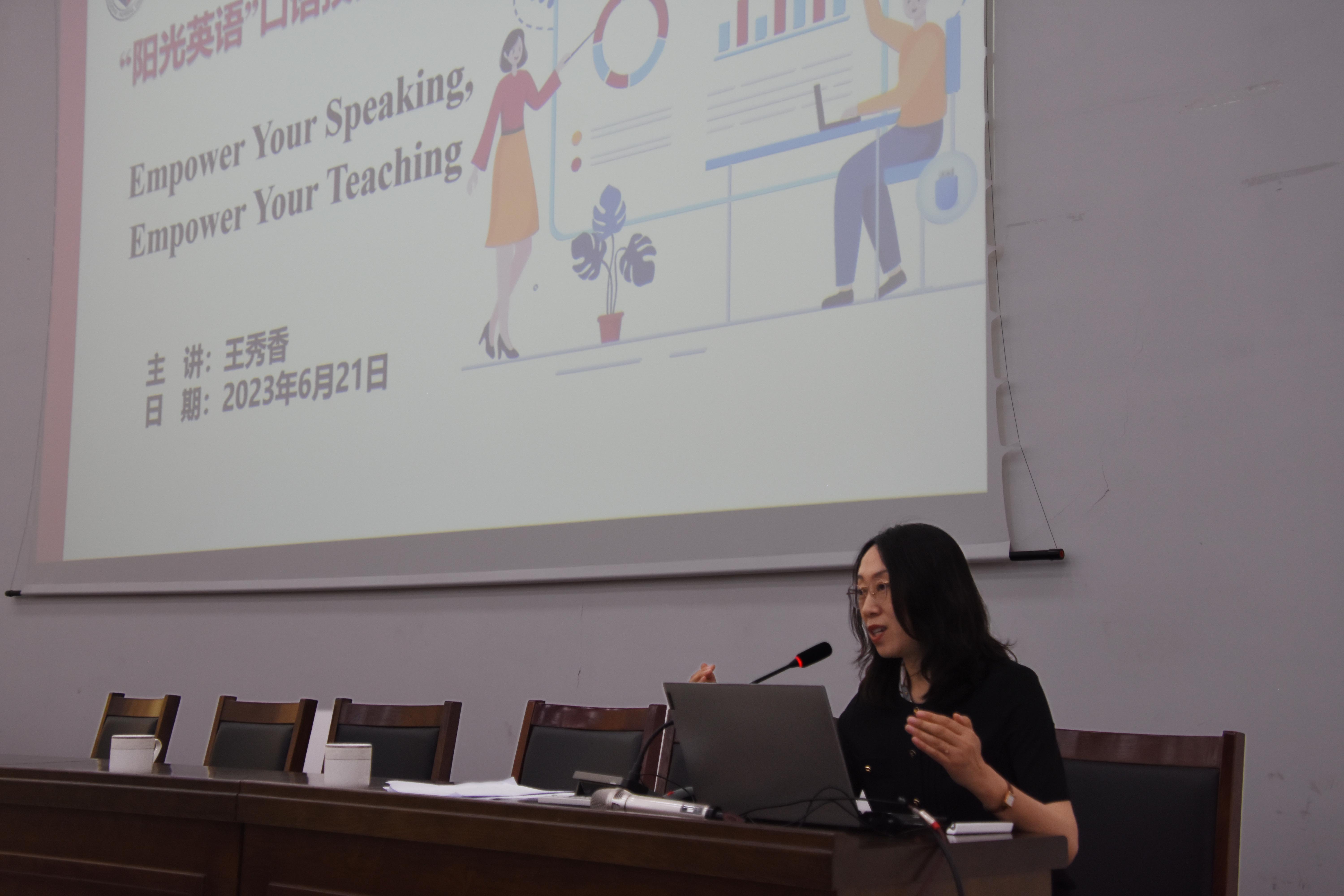 英语系赵笑飞老师此次培训的主题为 The Standards of English Pronunciation。赵老师的培训以语音学为侧重点,运用图示形式导入,娓娓道来,讲述了语音学自古有之,并向老师们展示了语音在国内外的发展历史及其分类情况。其中,有关双耳分听实验以及Mc Gurk Effect 更是引发参与培训教师的极大兴趣和好奇心。英语系刘奕男博士从词汇量和跨文化交流两个角度讲述英语口语技能的培养。刘博士以其风趣幽默、生动诙谐、轻松愉悦的上课方式向学员展示了英语口语学习应该重视生活实际,力求实现单词的字面含义和应用场景有机结合。英美文学文化教研室王秀香主任的培训以Empower Your Speaking, Empower Your Teaching 为主题,侧重提升英语口语能力,做好公众演讲。她以其丰富的指导学生参加演讲比赛的经验,向与会教师展示了英语演讲的理念。她从演讲的叙事内容以及表达技巧两方面入手,展示了如何才能做到用自己的故事走进听众的内心。其中,3分钟定题黄金比例、演讲的秘诀之微观创新、以及语言技巧的运用都对教师们下一步指导学生参加校内外各种演讲比赛有很大的借鉴意义和指导作用。