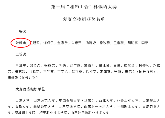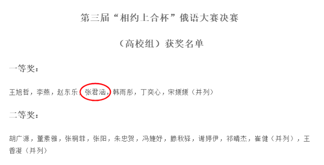 2022年12月30日,第三届“相约上合杯”俄语大赛在中国-上海合作组织地方经贸合作示范区落下帷幕。俄语系选派的2020级张君涵同学获得决赛一等奖。我校荣获优秀组织奖。