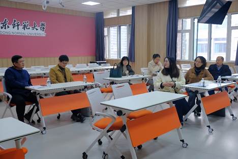 教学展示环节后,教学研讨活动在E323进行,由院级教学督导、英语系副主任王锦主持。首先,刘璇老师从本次授课的教学内容、方法和理念等方面介绍了教学设计与思路。之后,在场的院级教学督导就此次展示课给出反馈与点评。与会的青年教师也就如何借助技术手段进行视听说教学、如何保证专业基础课程大班授课的教学效果,以及如何选择、使用教材内容、课外补充教学材料等分享了自己的观点与做法。
