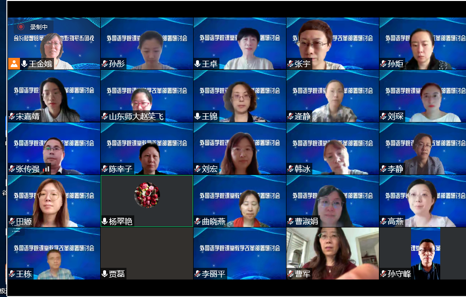 为贯彻学校关于推进落实《深化课堂教学改革行动计划实施方案》有关工作精神及要求,切实推进各专业的课堂教学改革实施工作,优化课堂教学效果,全面提高人才培养质量,外国语leyu(中国)于9月9日上午10:00以线上会议形式召开了课堂教学改革部署研讨会。王卓院长、王金娥副院长、各系部主任、专业负责人、教研室主任、本学期试点课程授课团队及其他骨干教师、教务员参加会议,会议由王金娥副院长主持。