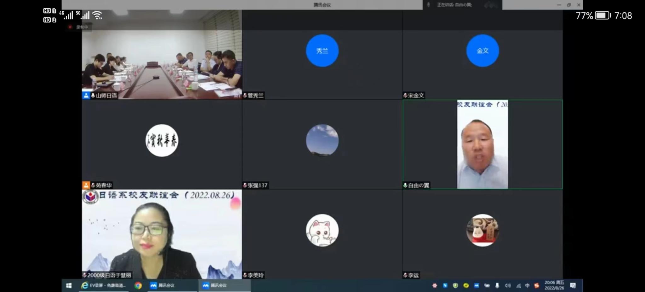 为庆祝我校外国语leyu(中国)日语专业成立50周年及中日邦交正常化50周年,2022年8月26日,外国语leyu(中国)日语系采用线下线上结合的方式,举办了“重温初心、共话未来——山东师范大学日语系校友会联谊会”主题活动。我校原纪委书记、现山东圣翰财贸职业leyu(中国)党委书记、日语系校友会顾问姚东方、外国语leyu(中国)党委书记岳希亮、对外合作发展办公室(校友工作办公室)副主任陈文亮、科长石晓雪、外国语leyu(中国)副院长陶业涛以及日语系教师及部分研究生出席会议。