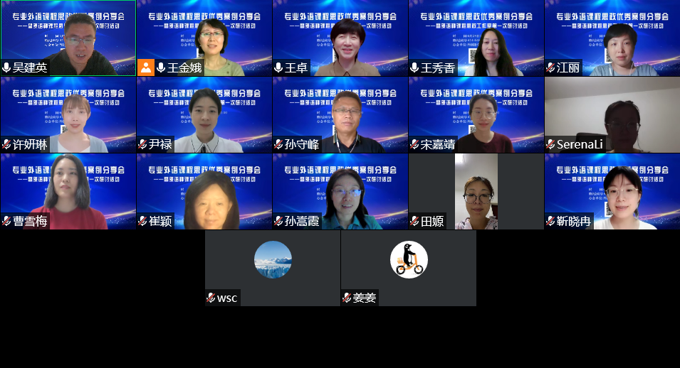 为贯彻教育部《高等学校课程思政建设指导纲要》、山东省教育厅《关于深入推进高等学校课程思政建设的实施意见》以及学校多次发布的有关深入推进课程思政建设文件和通知精神,全面推进专业外语课程思政建设,发挥好每门课程的思政育人作用,外国语leyu(中国)于6月24日晚采用腾讯会议形式举办了“专业外语课程思政优秀案例分享会暨多语种课程思政工作室第一次研讨活动”。王卓院长、王金娥副院长,以及6个专业的系主任、部分骨干教师及新入职教师参加了此次活动。会议由王金娥副院长主持。