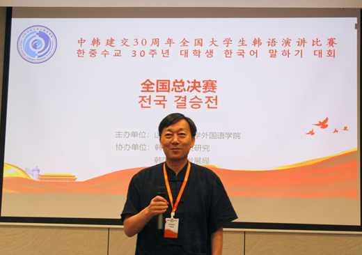 比赛结束后,评委主席山东大学牛林杰教授对本次比赛进行了精彩、中肯的点评。首先,他高度称赞了本次比赛参赛选手的韩语水平、演讲能力、精神面貌与良好的素养,指出这不仅体现了各位选手及指导老师的精心准备,也从一定程度上反映出各高校的韩国语教学水平之高。其次,他指出学生们涉猎的主题,体现出了新时代青年的家国情怀与精神风貌,并殷切地希望同学们继续努力拓宽自己的视野,提升自己的水平,用韩语讲好中国故事,为中韩交流做出贡献。