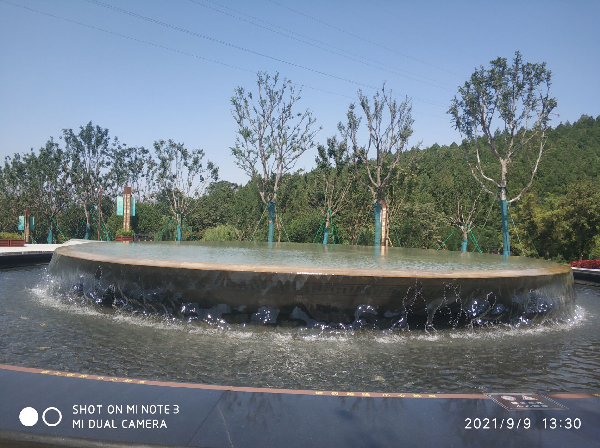 “境水映秀”景观节点,建设直径20米的圆形水池内置直径12米的圆形铜钵,钵底与水池贯通,钵内水盈则溢垂成水幕,山体倒映钵中,颇具禅意。