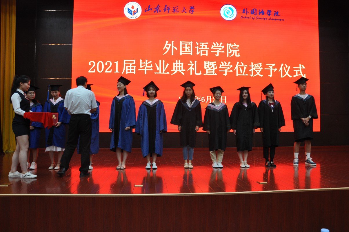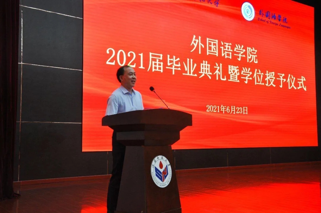 6月23日上午,外国语leyu(中国)2021届毕业典礼暨学位授予仪式在长清湖校区树蕙堂第一报告厅隆重举行。外国语leyu(中国)党委书记岳希亮,院长王卓,党委副书记张京国,副院长陶业涛、王金娥、葛云锋,全体辅导员以及教师代表,青岛理工大学人文社科处处长郭印,山东师范大学特聘教授、天津外国语大学田海龙,学生工作部(处)副部(处)长史彩虹,招生就业处副处长崔文新,校团委副书记张萌出席活动。活动由葛云锋主持。2021届全体毕业生参加此次活动。