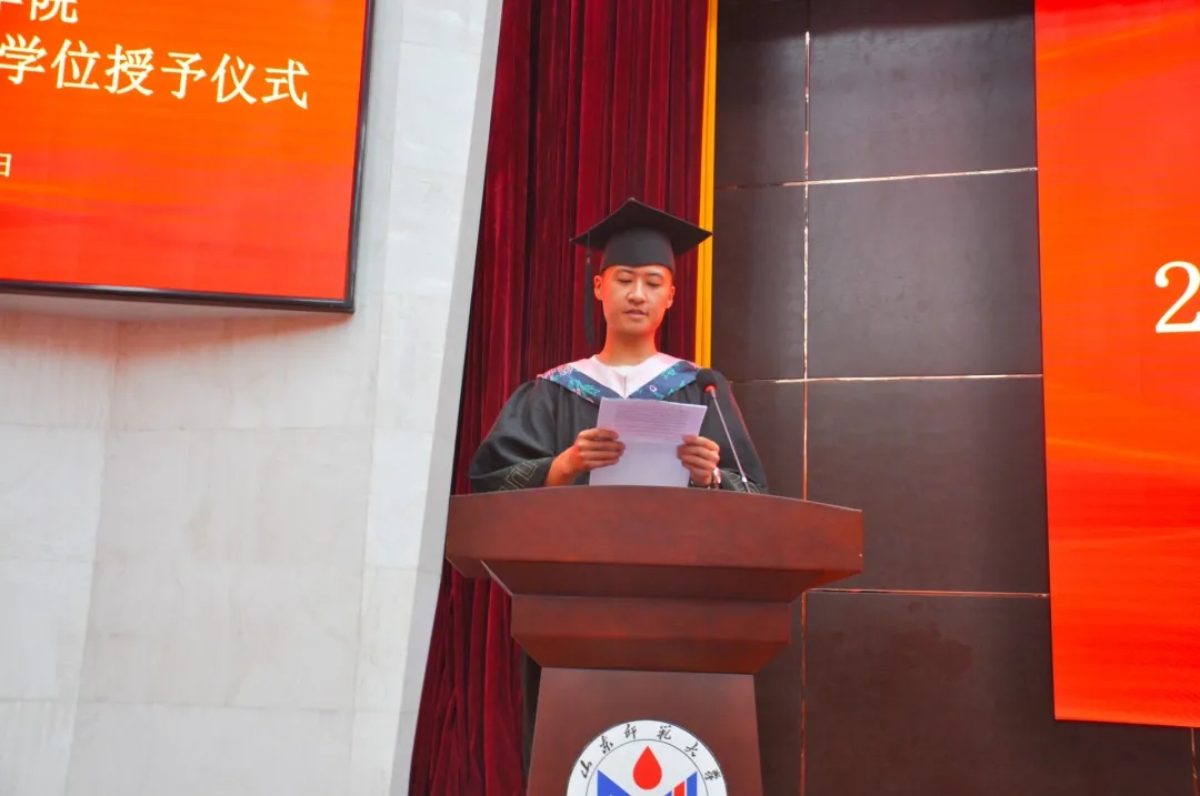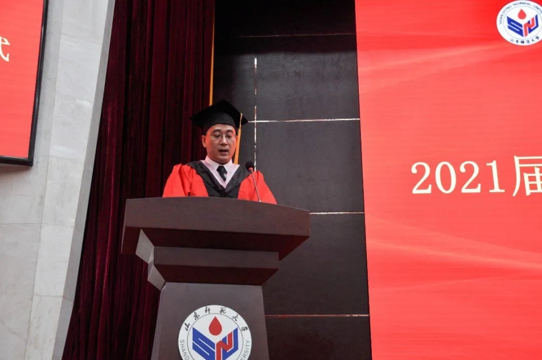 在庄严的国歌声中,典礼拉开帷幕。张京国宣读山东省、山东师范大学优秀毕业生名单,岳希亮为山东省优秀毕业生代表颁发证书,陶业涛为山东师范大学优秀毕业生代表颁发证书。随后,王金娥宣读学校授予学位文件,各系部教师代表为同学们拨穗正冠,并颁发学士学位证书和硕士学位证书。