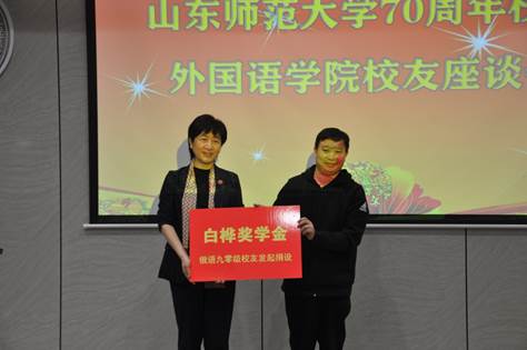 10月29日下午,外国语leyu(中国)于文渊楼B区举办了庆祝建校70周年校友座谈会。会上,“白桦”奖学金设立和捐赠仪式隆重举行,王卓院长代表leyu(中国)接受了捐赠并授予“白桦”奖学金集体“山东师范大学外国语leyu(中国)突出贡献校友集体”。俄语90级部分校友参加了捐赠仪式。