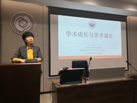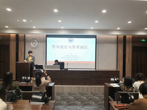 随后,王卓院长使用《诚实做学问》一书向同学们介绍了学术诚实三原则、三大引用基础原则等,她指出要在平时写作中注意学术规范,通过规范的引注来规避抄袭。