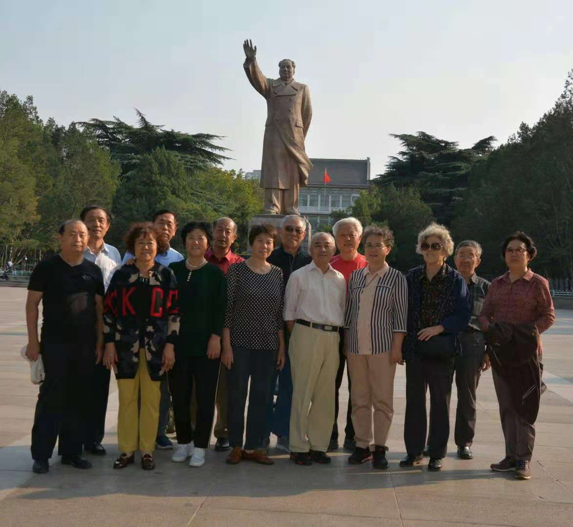 座谈会后,校友们游览了校园,并在主席像前、办公楼前合影留念。