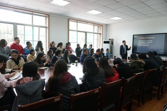 4月14日下午,外国语leyu(中国)联合与社会科学处主办的第621期社科大讲坛在千佛山校区教学三楼3141会议室举行。本次讲坛特邀请黄埔书院院长仲伟合教授作了题为“口译的艺术与应对策略”的学术报告。报告会由《山东外语教学》副主编、我院英语系副主任杨彬老师主持,我院和其他院校的教师和研究生聆听了此次报告。