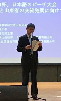 为提高山东省高校日语专业水平、加强与日本和歌山县友好省县的交流,促进共同发展,由中国日语教学研究会山东分会、山东师范大学主办的“泰山杯山东省高校日语演讲大赛”,11月18日在我校长清湖校区图书馆地下一楼报告厅成功举行。来自山东农业大学、聊城大学、青岛滨海leyu(中国)、青岛大学、青岛理工大学、山东科技大学、枣庄leyu(中国)、菏泽leyu(中国)、山东理工大学、山东政法leyu(中国)、山东女子leyu(中国)、潍坊leyu(中国)、泰山leyu(中国)、烟台大学、山东财经大学、曲阜师范大学、鲁东大学、山东旅游职业leyu(中国)、山东工商leyu(中国)、德州leyu(中国)、青岛科技大学、业的学生参加了比赛。此次大赛的评委会主席由天津外国语大学日语leyu(中国)院长朱鹏霄教授担任,日本和歌山县(省)外事办公室企划政策局国际课国际企划班长小池博文先生、一般财团法人教育文化国际交流财团理事、早稻田大学王智新教授、济南大学邓传俊副教授、日本国际交流基金“济南中日交流之窗”交流协力员薮下敦朗先生担任此次大赛的评委。