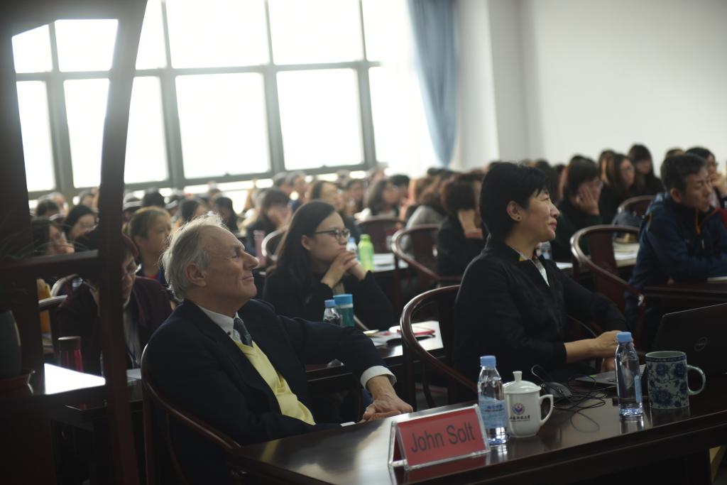 帕洛夫教授首先比较了庞德与西方学者对李白《长干行》一诗的不同译文,指出庞德在翻译其中的地名时常常采用直译的方法,而非对它们进行意译。庞德在《华夏集》、《诗章》等代表作中大量使用中国皇帝、欧洲地名、饭店名等专有名词,其目的不单纯是为了创造独特的意象,而有更深层次的考虑。她利用杜尚的“艺术唯名论”观念对这一现象进行了解释。庞德在诗歌中利用专有名词,表明可感事物不是对柏拉图的理念的模仿和分有,共相不是从可感事物中抽象出来的,只是人们的主观命名而已。庞德大量使用专有名词,打开了诗歌文本,丰富了人们的理解。随后,帕洛夫教授以《诗章》第55、78、105首为例,进行了详细阐释。讲座后,在座的师生与帕洛夫教授进行了热烈交流。