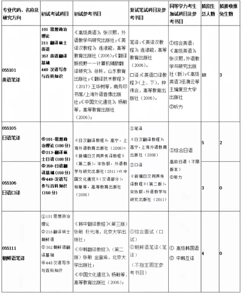 翻译硕士专业学位授予点(包含英语口译、英语笔译两个专业领域)设立于2010年,2020年增加日语口译和日语笔译两个专业领域。2022年增设朝鲜语笔译翻译硕士点。翻译硕士现有硕士生导师英语9人、日语11人、朝鲜语5人。该硕士点师资力量雄厚,人才培养理念先进,课程充分结合语言服务产业实践,兼具前沿性,其主干课程包括翻译技术实践、笔译工作坊等实用课程。本学位点专业导师科研成果突出,主持国家社科基金项目6项,中华学术外译项目5项(朝鲜语),国家后期资助项目1项(朝鲜语),国际合作项目3项(朝鲜语),省部级课题20余项;导师和专任教师的实践能力强,口笔译经验丰富,出版译著70余种,近2000万字,其中指导学生翻译出版译著40余种,建立了以出版项目驱动、以翻译技术应用为基础的特色教学模式,在全国同类专业中有较高的知名度。