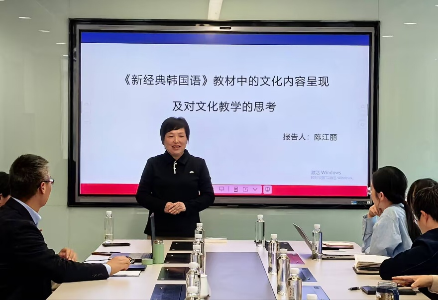 陈江丽老师围绕“《新经典韩国语》教材中的文化内容呈现及对文化教学的思考”发言。开篇,她首先对“新经典韩国语”系列教材及其使用优势、教材结构进行系统阐释,提出教材学科交叉编辑的重要性。在此基础上,围绕教材中的文化板块“学文化观天下”,系统介绍了外语教学中文化内容的选取标准。她指出,培养辩证性思维是文化教学中的高阶目标。