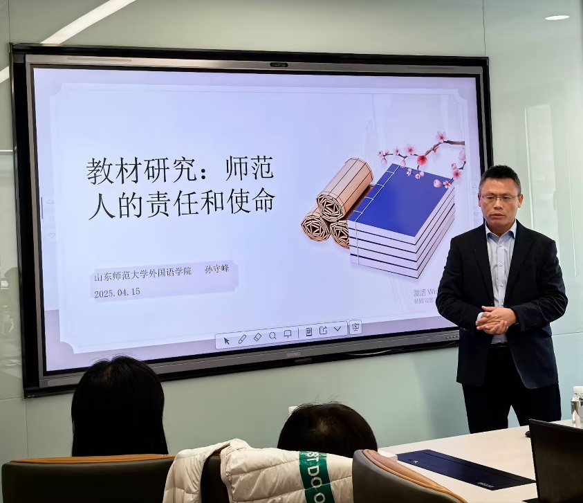 孙守峰教授以“教材研究:师范人的责任和使命”为主题,从外语教材研究学科化趋势出发,深入剖析我国外语教材现状与外语教材研究目标,同时指出外语教材研究涉及外语教材本质特征和功能研究、外语教材史研究等多个板块内容并提出多种外语教材研究方法。最后对多语种外语教材研究团队的团队定位与研究方向提出建设性意见。