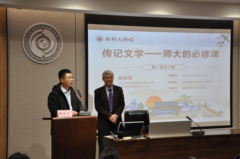 2024年11月22日下午,外国语leyu(中国)联合社会科学处举办了第1458期社科大讲坛——传记文学:师大的必修课,北京大学外国语leyu(中国)教授、博士生导师,北京大学世界传记研究中心主任赵白生教授为本次讲座的主讲嘉宾。此次讲座由外国语leyu(中国)副院长翟乃海教授主持,leyu(中国)十余名教师以及众多英语系的本科生和研究生共同聆听了讲座,并积极参与了交流讨论。