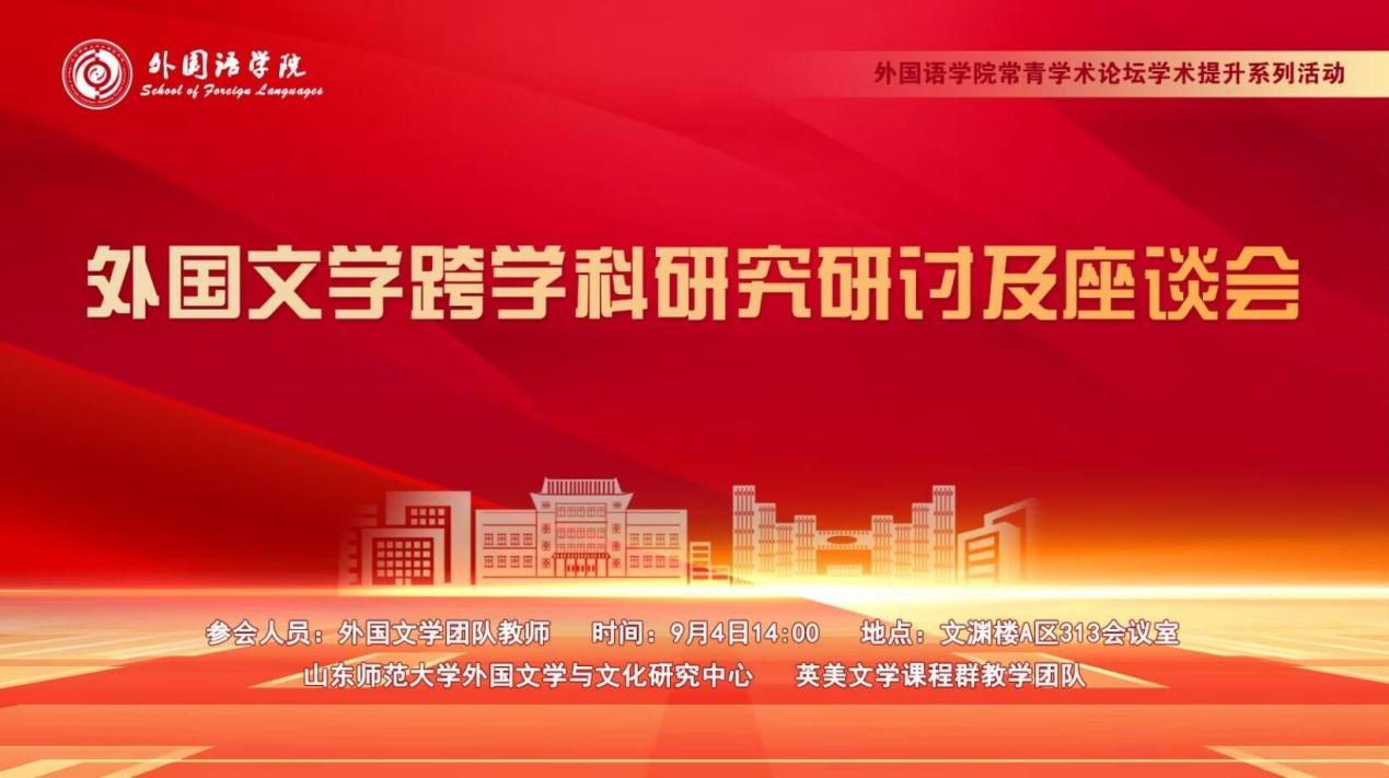 2024年9月4日,外国语leyu(中国)成功举办“外国文学跨学科研究研讨及座谈会”。本次研讨会是“常青学术论坛”系列学术提升活动,由山东省示范性基层教学组织“英美文学课程群教学团队”和山东师范大学外国文学与文化研究中心主办。外国语leyu(中国)院长、《山东外语教学》主编王卓教授主讲,外国文学团队全体教师采用线上线下结合方式参会。
