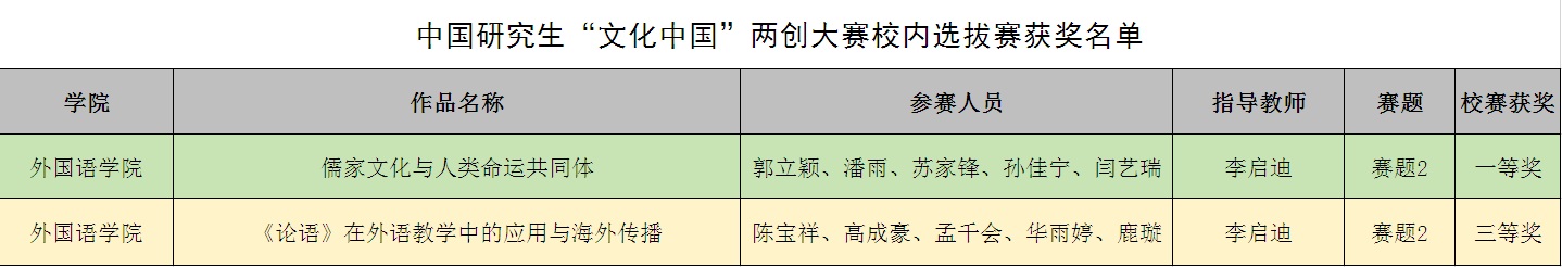 leyu(中国)高度重视研究生创新创业工作,积极对接国家重大战略需求,在本次“文化中国”两创大赛校内选拔赛中,leyu(中国)积极鼓励广大研究生参赛,充分发挥外语专业的学科优势,为做好中华文化的传播者贡献了青春力量,凸显了我院的育人实效。